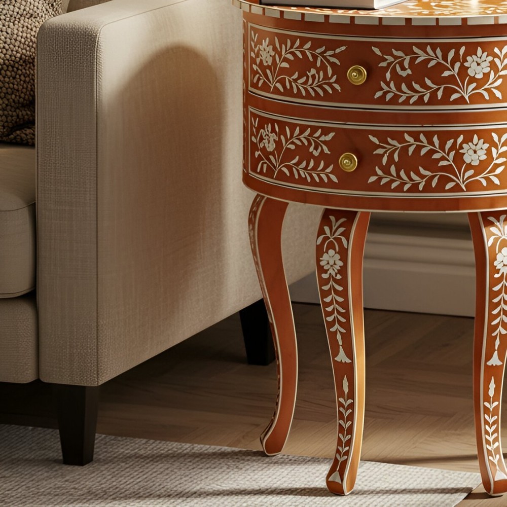 This gorgeous bone inlay end table is a showstopper! The vibrant orange floral design pops beautifully against the ivory inlay, adding a luxurious touch to my living room. I love the curved legs and compact size—it fits perfectly next to my sofa without crowding the space. The two drawers are surprisingly roomy, great for storing remotes or small decor. The craftsmanship is impeccable, with every detail carefully handcrafted. It feels sturdy yet elegant, like a true heirloom piece. Definitely worth the investment for anyone wanting to elevate their home with artisanal charm!