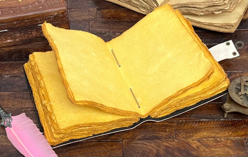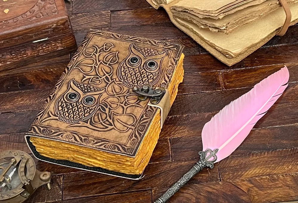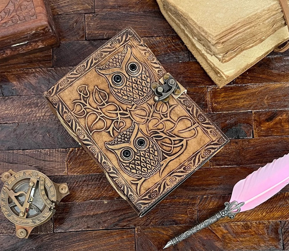 The Owl Journal is a beautifully crafted handmade leather notebook that doubles as a book of shadows or grimoire journal. Its luxury edition status, limited availability, and first edition design make it a unique and personalized piece for those seeking a special writing journal. Made in India with a leather cover, this notebook is sure to add a touch of elegance to any writing or planning endeavors. Owl Journal | Handmade Leather Notebook | Book Of Shadows | Grimoire Journal | Leather Journal Blank Spell book | Vintage Journal ★ Name :- OWL journal This Journal Is Made From A High Quality Leatherette With A tw Two Owl Embossed Finish And Vintage Looking Paper ★ DIMENSIONS :- The Journal Is Available In 3 Perfect Sizes. 10 Inches" x 7 Inches. 8 Inches" x 6 Inches. 7 Inches" x 5 Inches. ★ PAPER :-The Inside Of This Journal Is Handmade Decal Edge Paper That Looks Vintage And Well Stitched Whose Number Is 200 (Please Count Both side) If You Want White Plain Paper So Please Select Right Paper Option There Are Two Options Available. ★ HANDCRAFTED FROM GENUINE LEATHER: Each Journal Is Specially Designed And Handmade From Premium Leather. Artful Hand Stitching To Create A Timeless Space For Your Thoughts. ★ TELL YOUR STORY :- We Designed This Classic Leather Journal As A Time Capsule For Your Thoughts. Capture Your Important Memories, Accomplishments (And Failures), Life-Changing Moments And Evolving Dreams As A Keepsake To Reflect Upon In Years To Come. ★ THE PERFECT GIFT :-Quality You Can Trust: High-Quality Craftsmanship Makes This An Essential Tool For Poetry, Art, Sketching, Writing, Drawing, Calligraphy Leather Journal Give Your Loved Ones A Thoughtful Gift That Will Last For Years To Come! Great For A Birthday, Anniversary, Or Graduation Ignore :- Leather journal Book of shadows Grimoire journal Sketchbook Blank spell book Leather note book Vintage journal Handmade journal Antique journal Unique journal Journal with lock Journal with stone Deckle edges paper Black onix stone