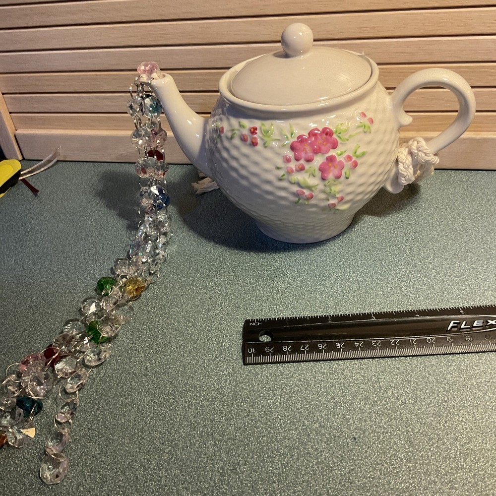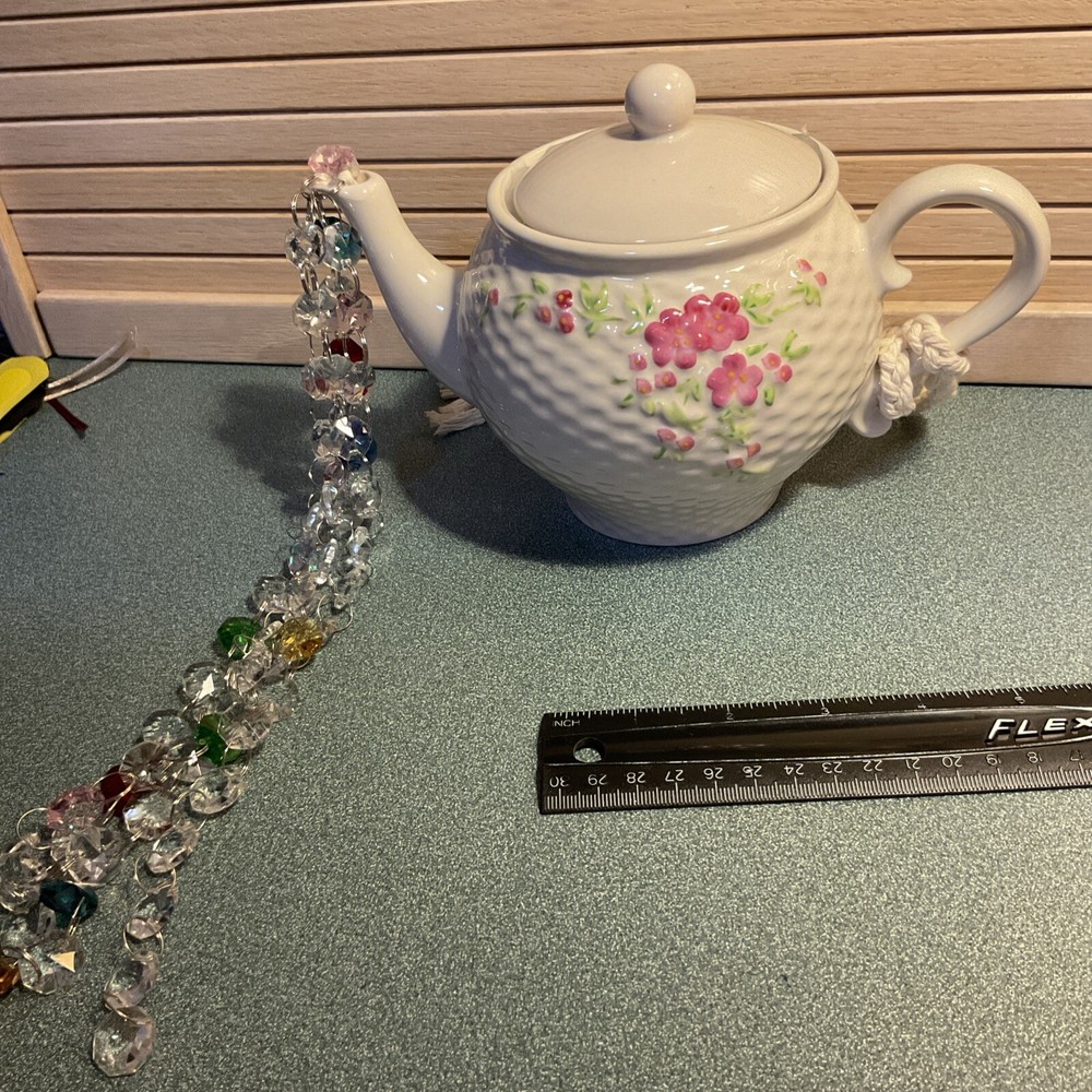 This is a medium-sized pink flower tea pot suncatcher made of leaded crystal and glass. It measures 10 inches in length, 10 inches in width, and 6 inches in height. Handmade in the United States, this decorative piece weighs 1 lb and can be cleaned with a damp cloth. Perfect for any room, this unique suncatcher adds a touch of handmade charm to your home décor.
