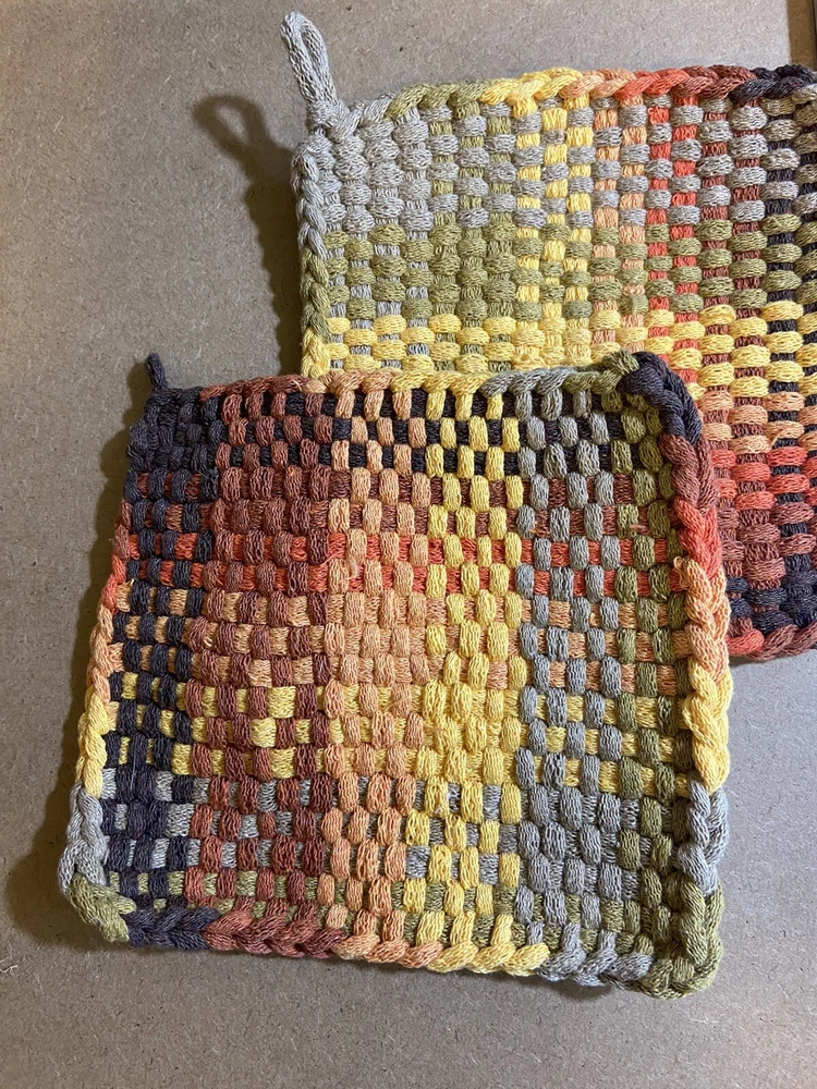 If you’ve never used these cotton pot holders/ hot pads, give them a try! They keep your hands protected. They are washable too! Bright colors. I have a few listed! Approx. 6”