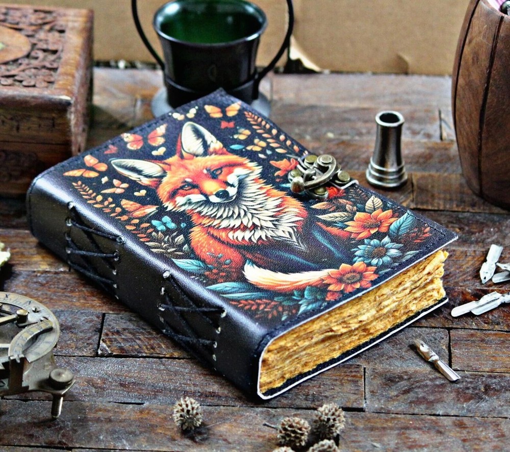 This Handcrafted Leather Fox Journal is a luxurious and limited edition notebook perfect for writing and sketching. The rustic leather cover adds a touch of elegance, while the personalized touch makes it a unique gift for any occasion. Made in India, this journal is a special addition to any desk or collection, ideal for those who appreciate handmade craftsmanship and attention to detail. Perfect for business, industrial, or personal use, this journal is a timeless piece that will inspire creativity and organization for years to come. Vintage lock closure • Genuine buffalo leather • Vintage deckle edge old paper • handmade rustic cotton paper • 100 Sheet (200 pages both side) Elevate your creative journey with our meticulously handcrafted Fox Leather Journal. Crafted with care and adorned with a stunning fox design, this rustic notebook is your perfect canvas for writing, sketching, or documenting your adventures. Each journal is a unique work of art, lovingly made from premium leather. Its acid-free pages provide an inviting surface for your thoughts, stories, and artwork. Whether you're an artist, writer, or nature enthusiast, this journal complements your creativity. The fox, a symbol of cleverness and adaptability, adorns the cover, inspiring you on your artistic endeavors. Embrace the charm of this Fox Leather Journal and let your creativity roam free. - Leather journal witchcraft book of shadows notebook is made with 200 pages of Antique Paper which looks like it was pulled from history. You will fall in love with the the antique handmade cotton paper which is unique to our Vintage Journal Notebook. ● The vintage clasp lock will keep all your valuable writing locked inside.Sturdy hand stitched binding to make sure that no paper comes out loose from your spell notebook. ● The witchcraft supplies journal is printed with a special seven stone called “Chakra healing” which helps to reveal inner truth within yourself and encourage self-awareness and self expression. We have taken extra to make sure that the emboss is perfect in every piece. ● Sketch, Doodle, Write on your Leather Blank Spell Journal with a Calligraphy Pen Fountain Pen, Brush Pen, Ball Pen, Acrylic Colours, Watercolor and many more. We guarantee no bleed through. ● Can be used as a notepad, journal, writing notebook, sketch book. 1.25 inch thickness, easy for handwriting, drawing or sketching and compact for carrying in your bag. Ideal for alternative ● Artist Sketchbooks, Photo Album, Traveling Notes, Business Executive, Logbook, Poetry Work, Journalists, Food Planner, Instagram Scrapbook and Bible Journaling. ● Best Gift For Your Companion: A Journal Is Like A Trusted Friend. You Can Use It To Solve Queries, Get Inventive, Or Record Valuable Memories For Them To Last Forever Or You Can Just Use It As A Gift For Your Wife, Son, Or A Daughter Or For Some Enthusiastic Writer In Your Family. Even For Looking For A Miraculous Spell Book Or A D&D Gamer Looking For His Quest Book. ● Perfectly Sized For Multi-Purpose Use: Length 5", Width 1", Height 7" Inches, This Easy To Carry Personal Diary Is Perfect To Use As A Health Journal, Sketchbook, And Poetry Journal. It’S An Ideal Journal Which Records Your Daily Thoughts And Life Lists. And Also Good For Designing, Doodling, Or Calligraphy Of Your Choice. Handcrafted Leather Fox Journal Rustic Notebook for Writing & Sketching Gift for him her, Blank spell Book of Shadows, Handcrafted best gift ignore. Grimoire journal leather notebook book shadow leather sketchbook leather journal junk journal witchcraft journal spell book book of shadows sketch book leather bound journal black journal fox journal