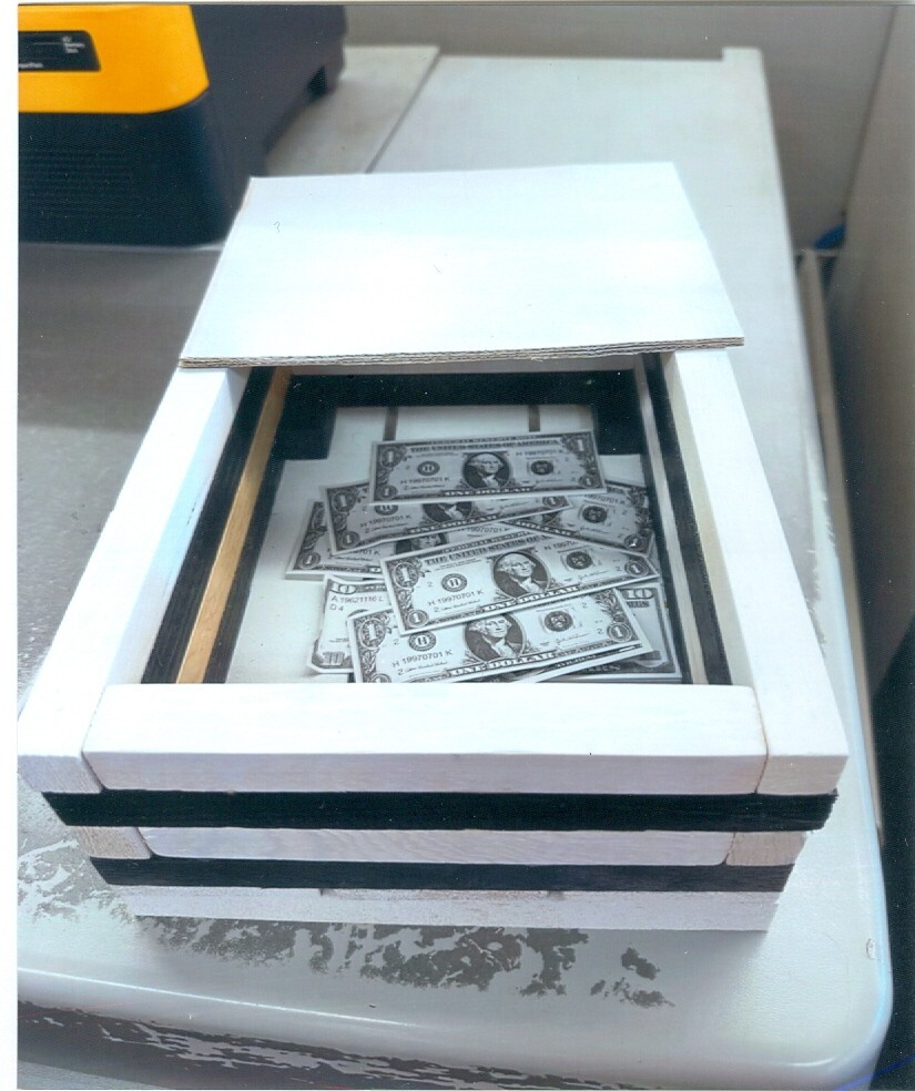 This is a very useful and attractive item to have in your kitchen or bathroom. A spice rack and a diversion safe all in one ! It's made with solid pine and each section is painted black or white and then assembled. The tray inside is easily removed and large enough to hold cash and cards. I took these pictures in my shop, I hope it looks ok. I got the idea for this from an old show called {The Wild Wild West.} In one episode {James and Artemis Gordon} had a spice box and a cigar box on their train like this in which they hid a derringer. That's where I got the idea from !