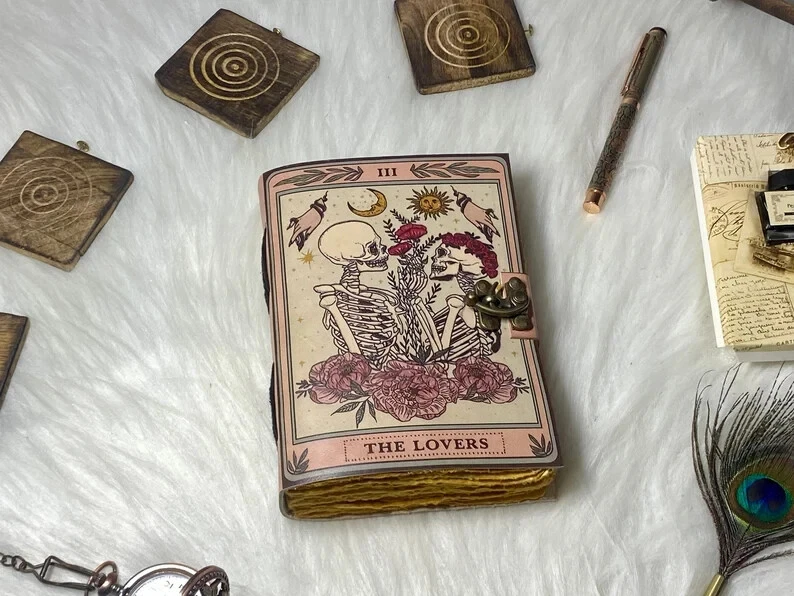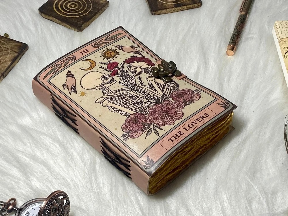 The Lovers Book of Shadows Handmade Leather Journal Grimoire Journal with Deckle Edge Paper Gifts for Men and Women Details :- Grimoire The Skull lover Leather Print journal Antique Notebook And Deckle Edge unlined paper. The lovers • Size - 7×5 inches,8 x 6 inches, 10x7 Inches 13X10 Inches • Color - • C-Lock • genuine leather • vintage deckle edge old paper • 100 Sheet (200 pages both side) ● Antique Paper - Vintage Journal is made of unique vintage paper which looks like it was pulled from history. You will love the old looking handmade cotton paper (200 pages) which is unique to our vintage journals. ● VINTAGE LOCK AND STURDY BINDING - The vintage lock will keep all your valuable writing locked inside.Sturdy hand stitched binding to make sure that no paper comes out loose from your vintage notebook. ● Sketchbook is great for keeping by the bedside to jot down dreams, or for use as a diary or journal. ● It is a truly unique and wonderful gift for a friend, the men, women, and wiccans in your life! or to treat yourself to as a special keepsake ● our journals are influenced by symbolism that is derived from the Wicca/Pagan community, creating a personalized space where your inner creative genius can flourish. ● The paper is made from sustainable cotton and jute canvas. The paper is acid-free and pH neutral therefore is a timeless piece of art. ● Use Any Kind Of Pen - Sketch, Doodle, Write on your journal notebook with a Calligraphy Pen Fountain Pen, Brush Pen, Ball Pen, Acrylic Colours, Watercolor and many more.