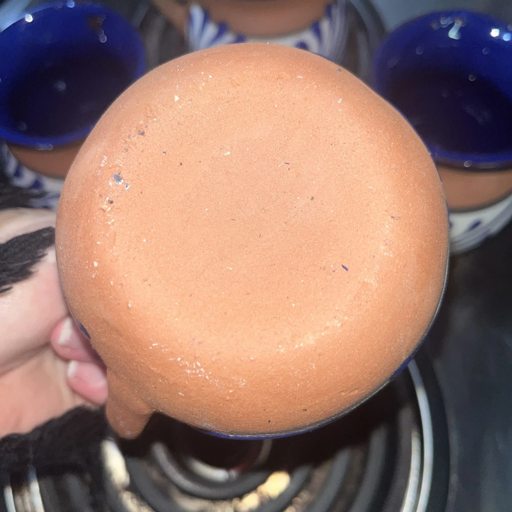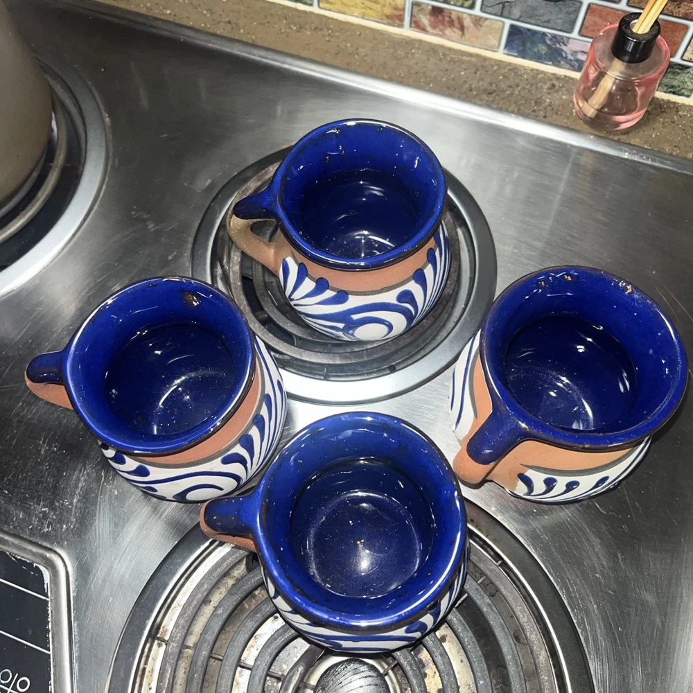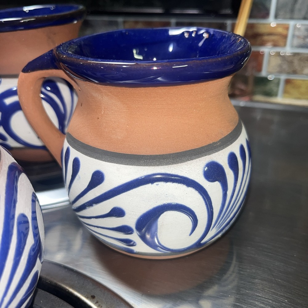 This Mexican Coffee Hot Chocolate Clay Mug Set includes four round mugs, each hand-painted with a swirl pattern in clay, blue, and white glaze. The vintage mugs have a 12oz capacity and are specifically made for hot beverages, such as coffee or hot chocolate. Manufactured in 2000 in Mexico, these unique mugs are a part of a set perfect for all occasions and feature traditional Mexican craftsmanship and style. The mugs are recommended to be hand washed and are ideal for those who appreciate authentic, hand-made pottery.