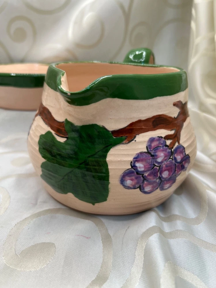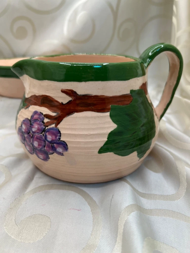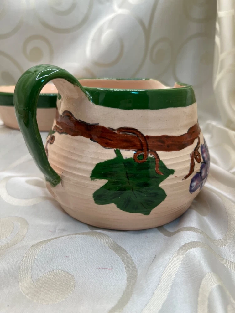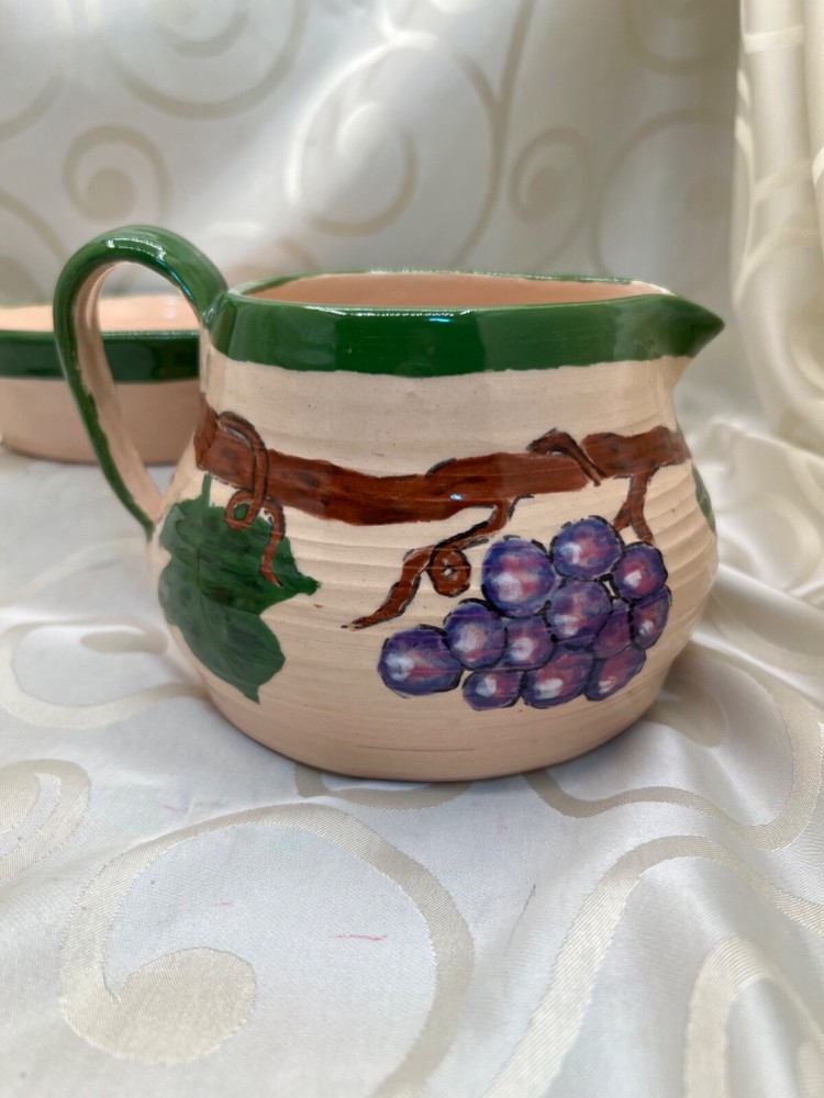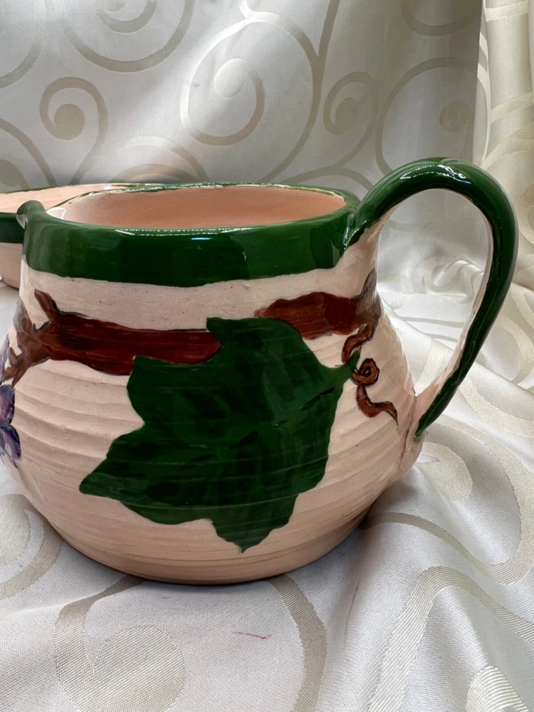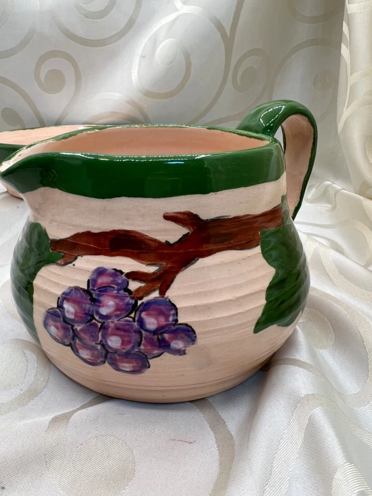 Handthrown in the United States, this handmade pottery set includes a pitcher and plate featuring a design of grapes and leaves. Crafted from clay using pottery techniques, these multicolored pieces showcase an art pottery production style. Ideal for serving beverages or as decorative items, this set adds a touch of unique charm to any setting.