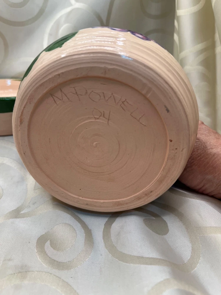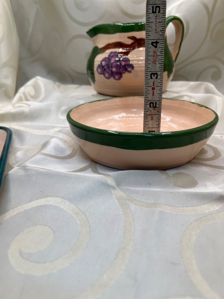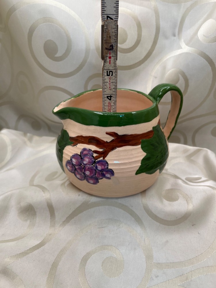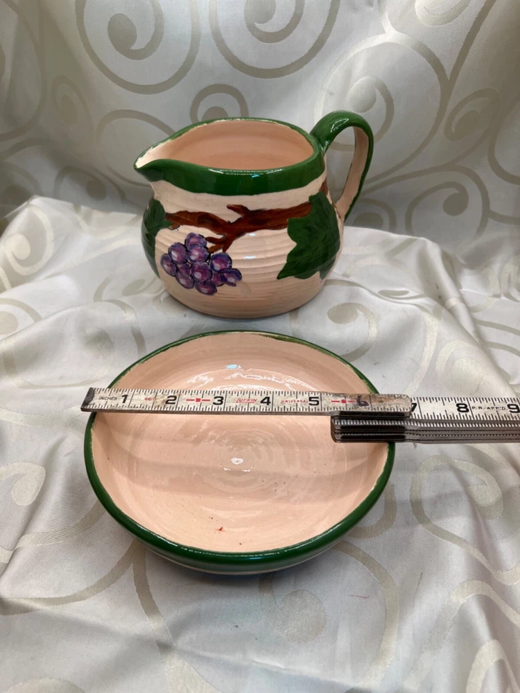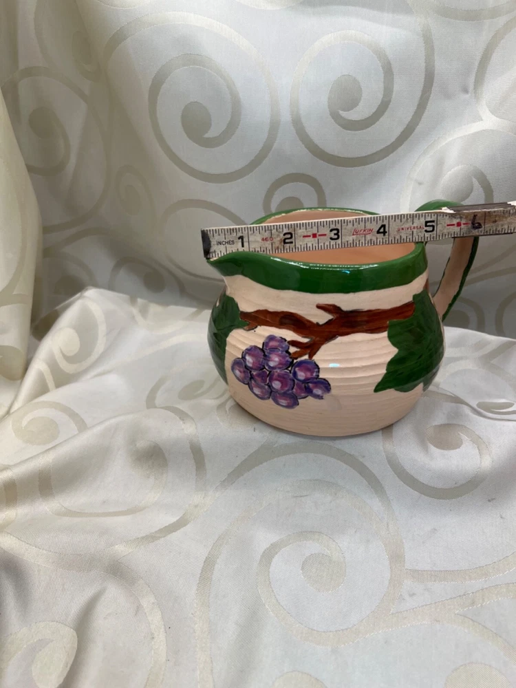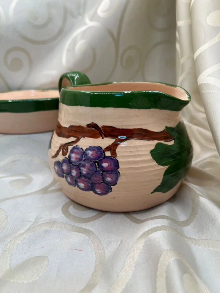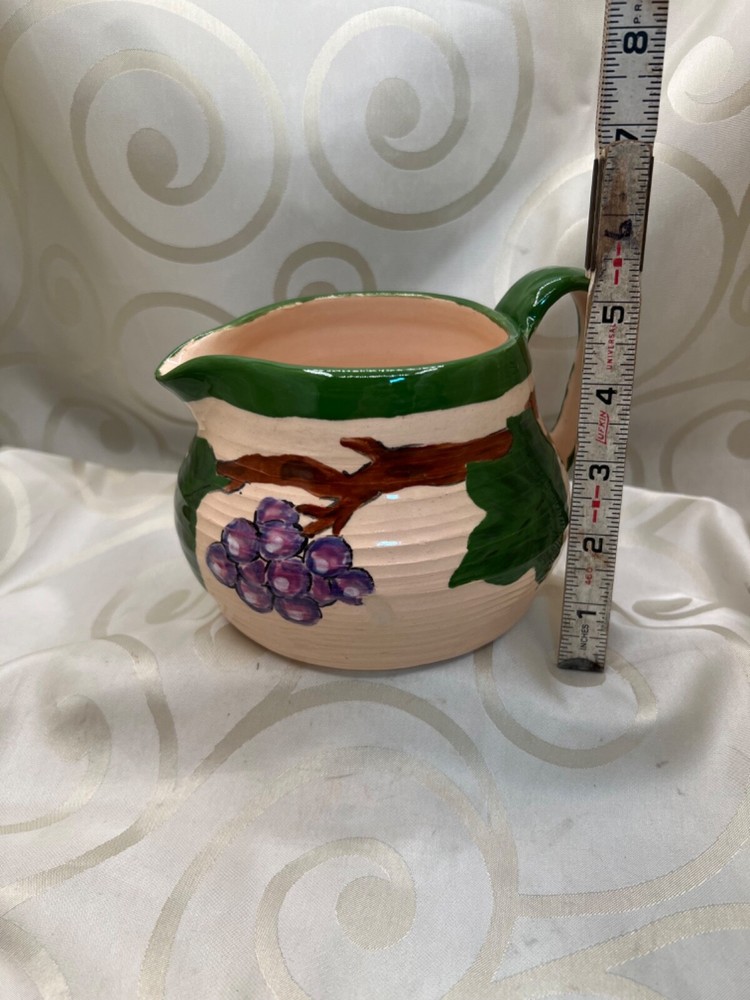Handthrown in the United States, this handmade pottery set includes a pitcher and plate featuring a design of grapes and leaves. Crafted from clay using pottery techniques, these multicolored pieces showcase an art pottery production style. Ideal for serving beverages or as decorative items, this set adds a touch of unique charm to any setting.