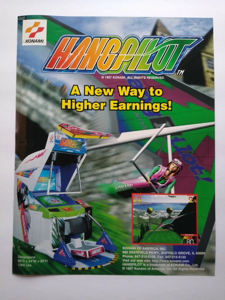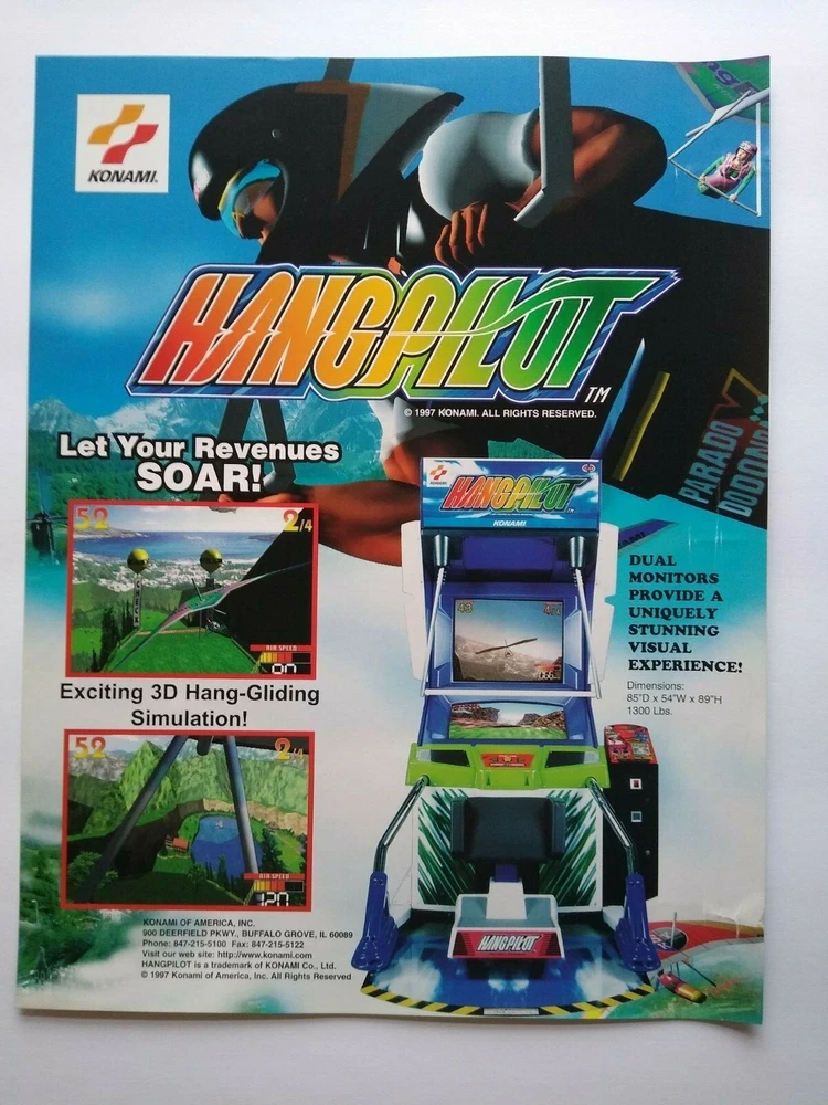 Hang Pilot Arcade Flyer Konami Original Video Game Art Print Hang-Gliding 1997 Original paper promo sales flyer. Single page one sided artwork sheet. Has creases, wrinkles, and age wear. Flyers are perfect for framing and make great wall art. A flyer is an paper promotional advertising art print sheet made for coin operated amusement arcade games. Also called a circular, brochure, pamphlet, or flier. Size is 8.5" X 11". Plastic protector included with each flyer sold. More pinball, jukebox, slot machine, and vintage arcade game items for sale in our store. SHIPPING Bundle and save by using cart and making single payment. International buyers are responsible for any import fees/taxes. ABOUT US Seller of vintage retro collectibles, pop culture, paper ephemera, new old stock advertising, artwork, original pinball flyers, vinyl records, Mr. Peanut, video arcade flyers, pinball machine parts, game manuals, pinball promo plastics, Mad magazines, antique Halloween and holiday postcards, Christmas items, super hero memorabilia, horror themed art, gifts.