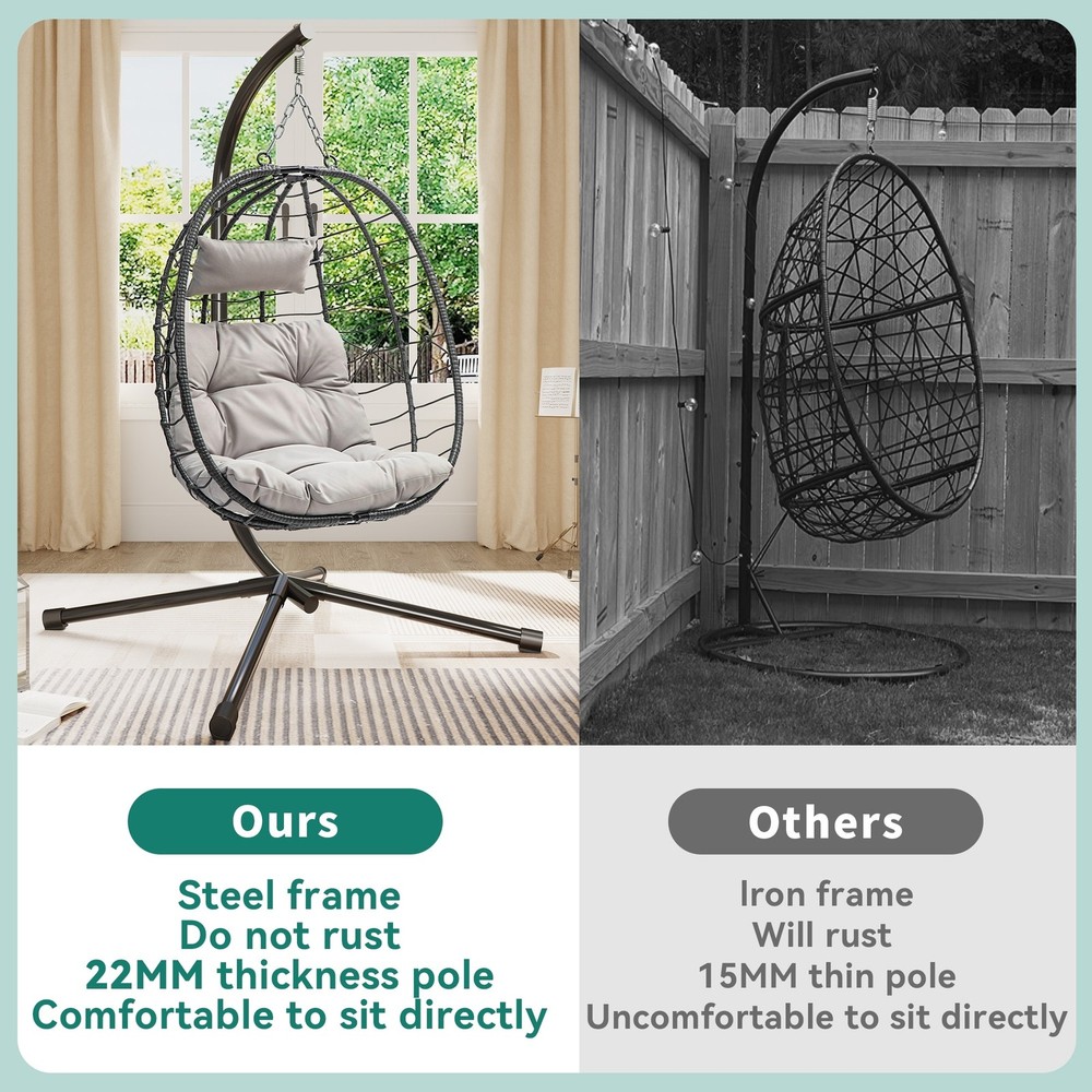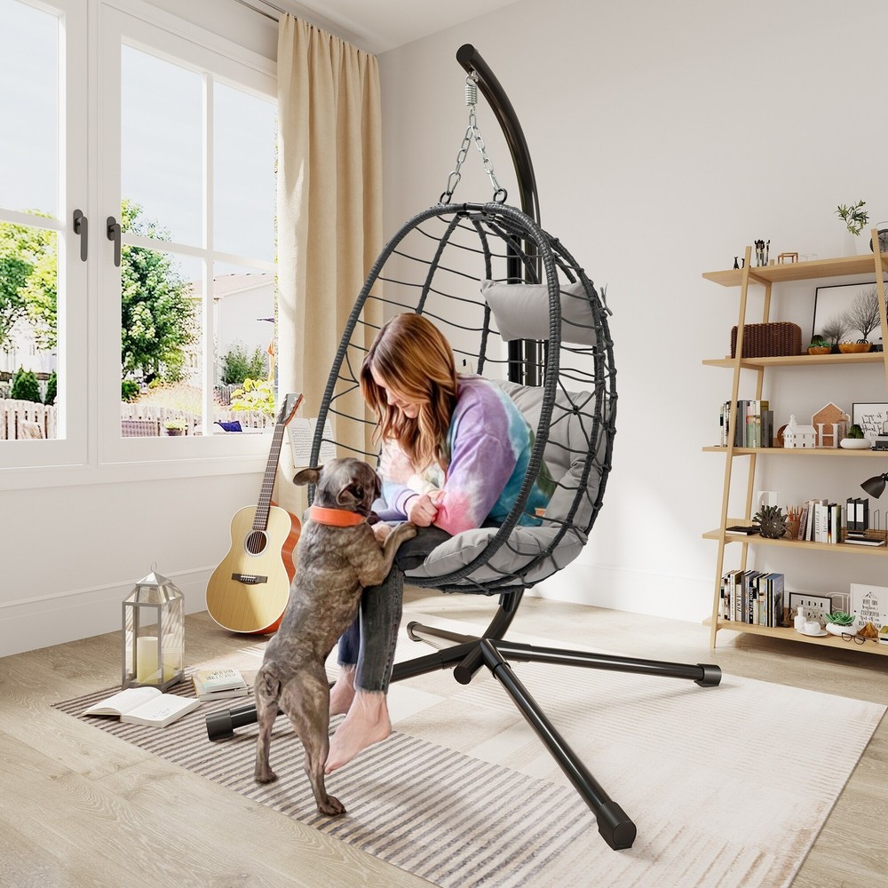 Add a distinctive touch to your backyard or patio space with this modern swing chair. The stand and chair are made from metal, while the egg-shaped chair is made from resin rattan in an open wicker weave. We love that the rattan is resistant to water, fading, mildew, and corrosion, so it stands up to regular outdoor use. This chair accommodates up to 250 lbs. And is suspended by a metal chain. Handles on the sides of the chair opening allow you to sit back and exit the chair with ease. Plus, a seat cushion and headrest cushion are included for additional support. The cushions are filled with synthetic fiber and upholstered in a weather-resistant polyester blend. Free Shipping Over $49.99* Details Swing Chair with Stand Product Description: Add a distinctive touch to your backyard or patio space with this modern swing chair. The stand and chair are made from metal, while the egg-shaped chair is made from resin rattan in an open wicker weave. We love that the rattan is resistant to water, fading, mildew, and corrosion, so it stands up to regular outdoor use. This chair accommodates up to 250 lbs. And is suspended by a metal chain. Handles on the sides of the chair opening allow you to sit back and exit the chair with ease. Plus, a seat cushion and headrest cushion are included for additional support. The cushions are filled with synthetic fiber and upholstered in a weather-resistant polyester blend.