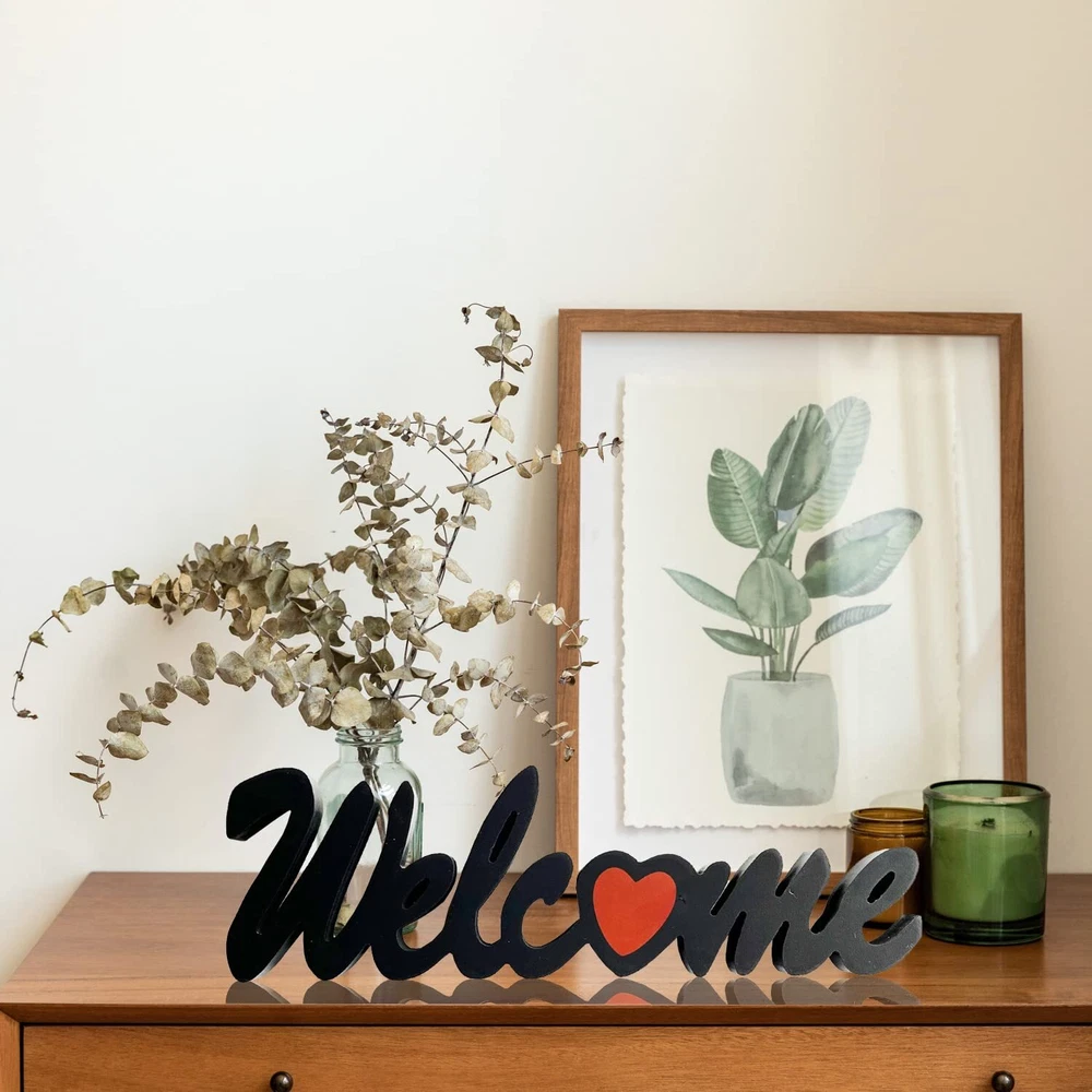 The Welcome word cutout table sign adds a classic charm and personal touch to any room in your home. Black letter standing centerpieces tabletop decoration with 1 inches width can be easily free standing on the table, mantel or other countertop. Wood hanging Welcome sign can create sweet and warm atmosphere with cutout welcome letter with a red heart design. The home cutout letters sign makes a unique gift idea for your friends, family or anyone you love. These wood sign for home decor blends seamlessly with any modern, farmhouse, country, vintage or rustic design room style. Rustic Hanging Wood Word Welcome Sign is made of high quality MDF, cutout word Welcome with a red heart replacing letter O. Sturdy and unique design. Black Block Letter Sign Wall Decorations measures 16" X 1" x 5". Wood Welcome table sign comes with two metal hangers at back and ready to be mounted on the wall or just place on any tabletop or countertop. Free Standing Welcome Word Sign Table decor can firmly stand on the tabletop or counter of the kitchen, dining room, living room, book shelves, office or any flat surface you like. Cutout Welcome Letter Table Decoration is a great housewarming gift, birthday gift, Mother's Day, Father's Day, Valentine's Day, wedding gift, Christmas gift for friends or families! Wooden Welcome Heart Centerpieces Decor for Tables & Mantel is designed with antique and modern elements for a unique and stylish look. Complement any room styles. Bringing a touch of charming accent to your home.