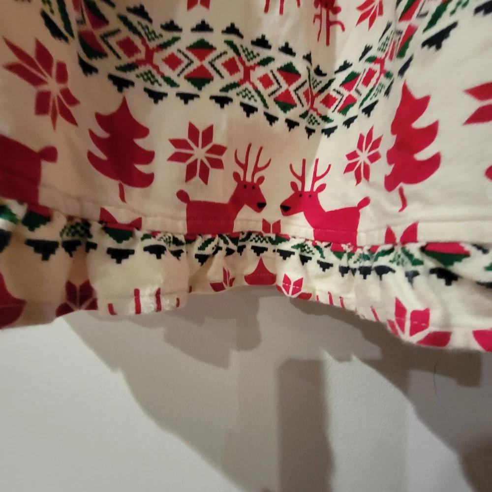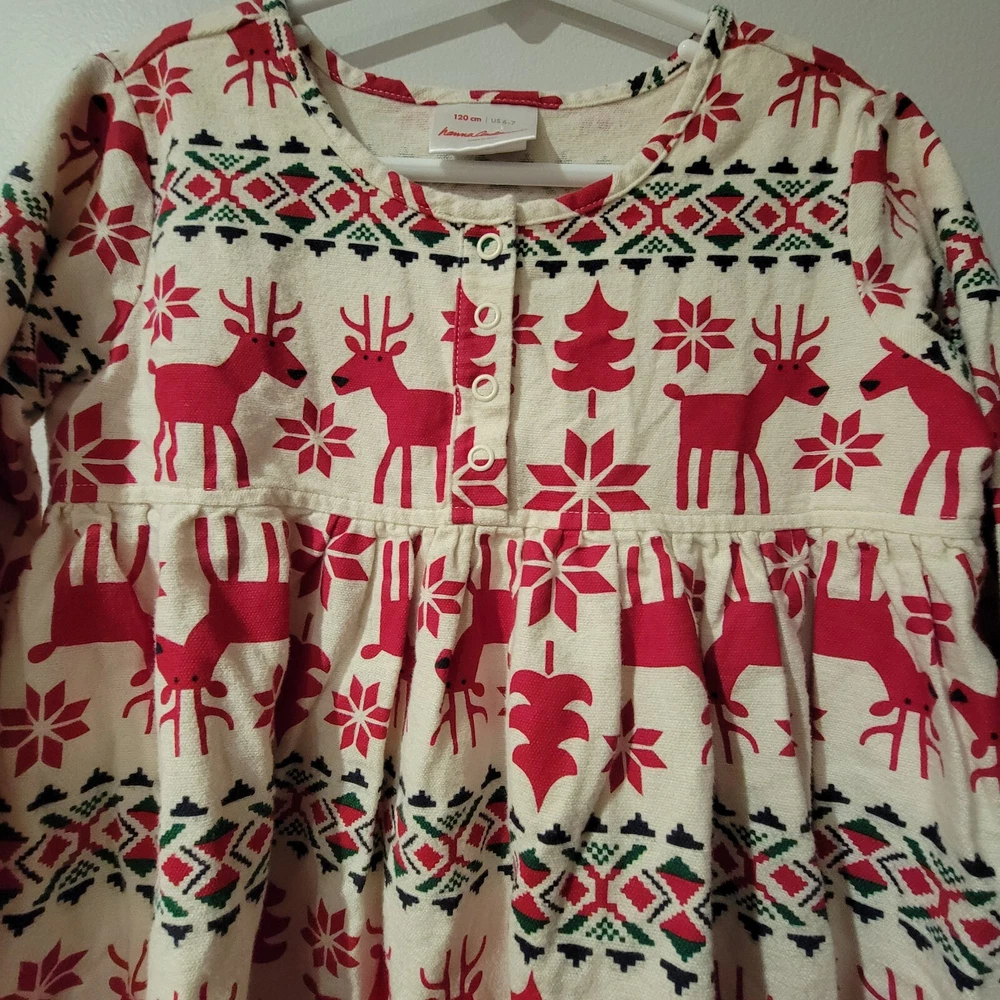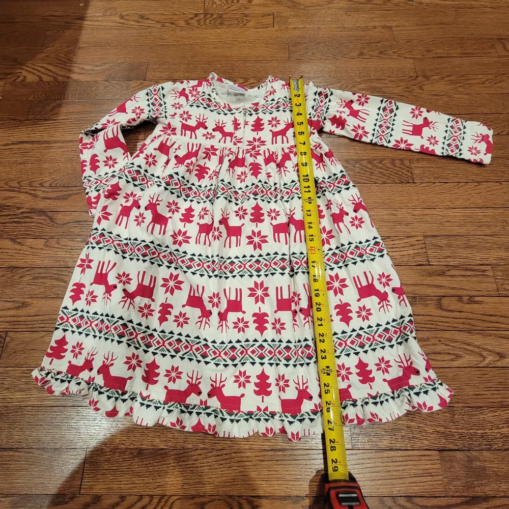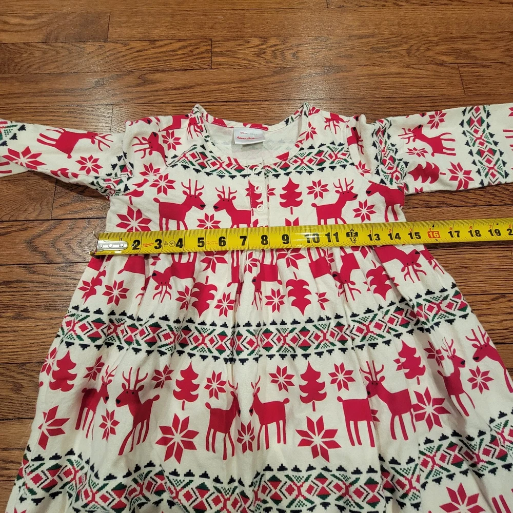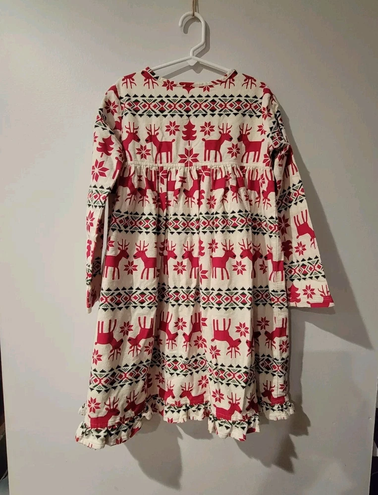 NWOT Adorable Christmas Holiday Dress and or Pajama dress- Perfect for holiday photos or holiday themed party Ruffled hem 4 snap button closure on the chest Made in Peru 62% Cotton 38% Modacrylic- nice thicker material Light beige base with red reindeer and trees. Green, blue and red Aztec print Little one decided to go with a different dress just trying to recoup what I paid for it. Fast shipper