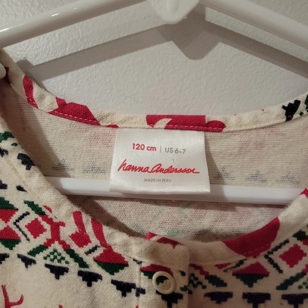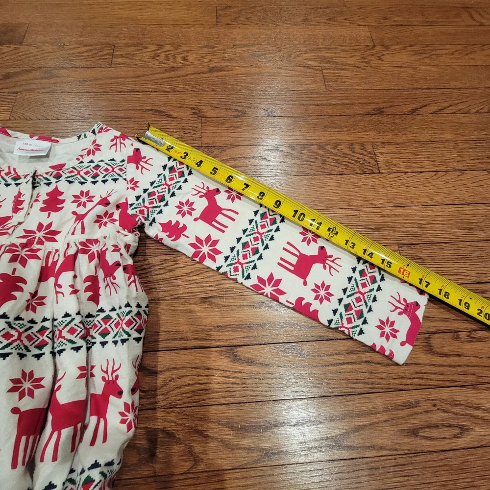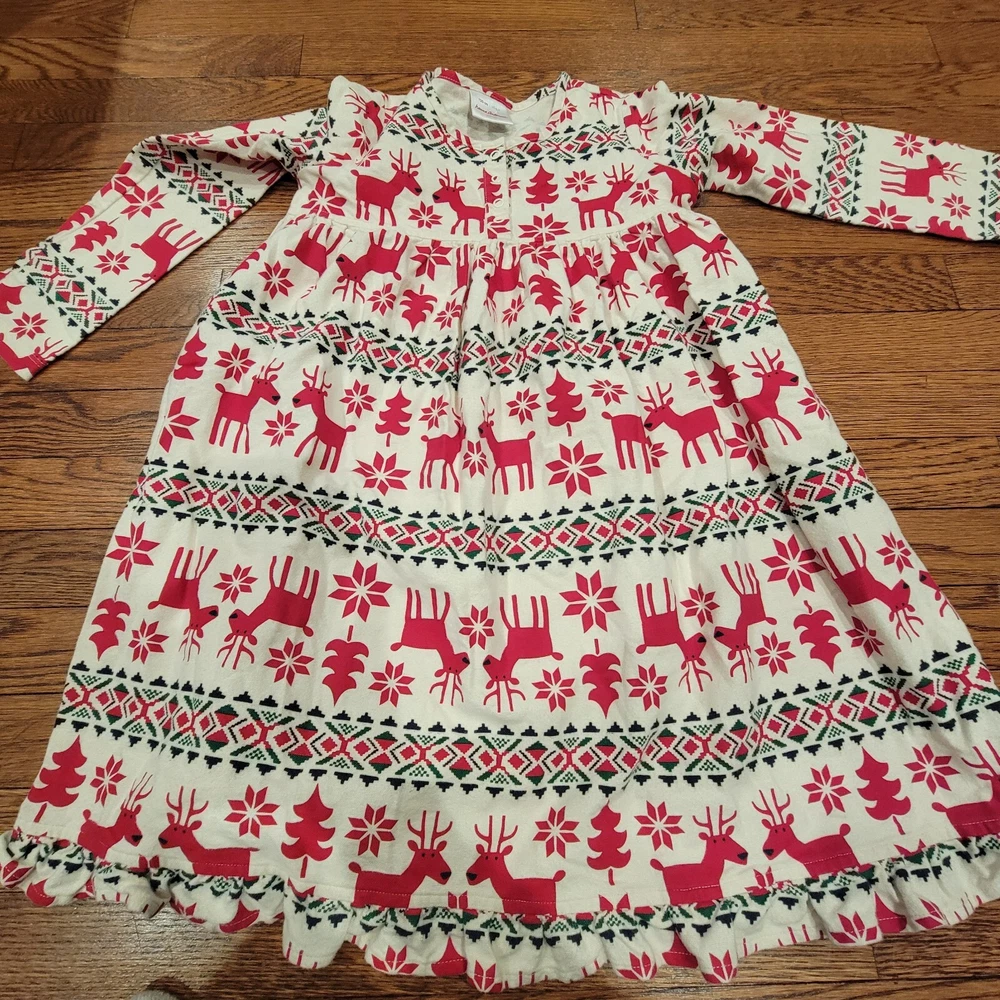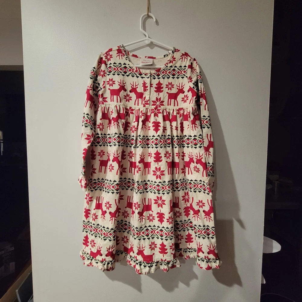 NWOT Adorable Christmas Holiday Dress and or Pajama dress- Perfect for holiday photos or holiday themed party Ruffled hem 4 snap button closure on the chest Made in Peru 62% Cotton 38% Modacrylic- nice thicker material Light beige base with red reindeer and trees. Green, blue and red Aztec print Little one decided to go with a different dress just trying to recoup what I paid for it. Fast shipper