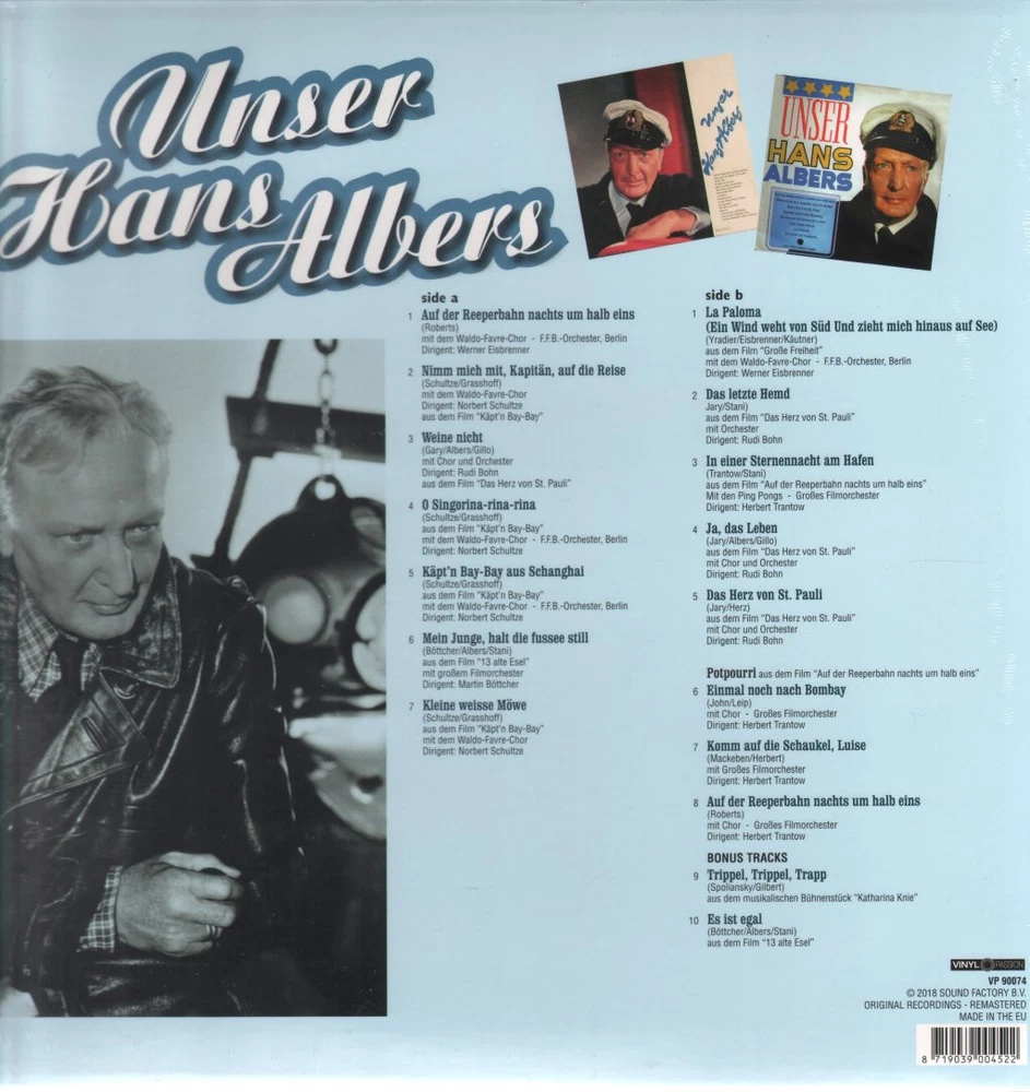 GRADING Our Grading System The table below is an overview of how our grading system works. The first grade is for the sleeve and second grade is for the media/disc, e.g. VG+/EX means that the item's sleeve is in Very Good Plus condition and the media/disc is in Excellent condition. If there is only one condition, e.g. /EX, it means that the item is not in a picture sleeve and that the media/disc is in excellent condition. Records that aren't in picture sleeves will either be in a company sleeve or a generic plain sleeve. If you have any questions, please get in touch. Condition Sleeve Media MINT (10/10) Mint, perfect Mint, perfect EX+ (9/10) Excellent plus, near mint Excellent plus, near perfect EX (8/10) Excellent, well looked after, clean, only slight signs of use Excellent, well looked after, clean, only slight signs of use EX- (7/10) Excellent minus, light wear and signs of use Excellent minus, light wear and signs of use VG+ (6/10) Very good plus, some moderate wear Very good plus, some scuffs, no deep marks VG (5/10) Very good, well used and worn Very good, well used and marked VG- (4/10) Very good minus, very worn Very good minus, very worn and marked GOOD (3/10) Good, some major wear Good, some major wear and scuffing FAIR (2/10) Fair, major wear Fair, major wear and scuffing POOR (1/10) Poor, severe wear Poor, severe wear and scuffing DELIVERY Combined Postage If you add all the items you wish to purchase from us to your shopping basket/cart, and then go to the checkout page from the shopping basket page, the shipping cost will be automatically combined. Packaging All of our items are parcelled using strong specially designed packaging, each vinyl in an order is placed in a clear plastic sleeve and plain paper white sleeve, and is separated from its cover (unless it is advertised as sealed), to prevent any damage during transit. If an item is sealed, and you would prefer the vinyl to be placed outside of its sleeve before dispatch, please let us know. Prices You can see all delivery options and prices for an item on the "Postage and payments" tab. Tracked delivery If you wish to have a tracking number with your order, please select the "Signed" or "Express" delivery option, "Standard" delivery does not include a tracking number. SHOP Click here to view our Ebay shop, with over 200,000 items in stock CATEGORIES Shop Home 10" Vinyl Records 12" Vinyl Records 7" Vinyl Records Cassettes (Tape) CDs (Compact Discs) LP Vinyl Records Music Memorabilia Other Artist Hans Albers Title Unser Hans Albers Format LP Vinyl Country Europe Label Vinyl Passion Catalogue Number VP90074 Year 2018 Description 17 track still sealed Condition NEW Track List A1. Auf Der Reeperbahn Nachts Um Halb Eins A2. Nimm Mich Mit, Kapitän, Auf Die Reise A3. Weine Nicht A4. O Singorina-Rina-rina A5. Käpt'n Bay-Bay Aus Schanghai A6. Mein Junge, Halt Die Füße Still A7. Kleine Weiße Möwe B1. La Paloma (Ein Wind Weht Von Süd Und Zieht Mich Hinaus Auf See) B2. Das Letzte Hemd B3. In Einer Sternennacht Am Hafen B4. Ja, Das Leben B5. Das Herz Von St. Pauli B6. Einmal Noch Nach Bombay B7. Komm Auf Die Schaukel, Luise B8. Auf Der Reeperbahn Nachts Um Halb Eins B9. Trippel,Trippel,trapp B10. Es Ist Egal DELIVERY INFORMATION If you wish to have a tracking number with your order, please choose the Signed or Express delivery option, the Standard delivery option does not include a tracking number. Please note, the Express option for delivery outside of the UK includes a tracking number, but has the same delivery time as the Standard option. PLEASE NOTE For display and security reasons, new release items may have been removed from their sleeves. If you wish to receive a sealed copy of a new release item please check that we have one available before placing your order. If a sealed copy isn't available we may be able to order another copy in for you. If you would prefer for sealed items to be removed from their sleeves to avoid seam splits and sleeve damage in transit, then please let us know and we will arrange this. ABOUT US Vinyl Tap has been in the business of selling music for over 30 years, and in that period we have supplied many thousands of collectors and music fans around the globe with vinyl, CDs and music memorabilia. You can check out the over 200,000 items that we have in stock on our Ebay shop, here . Artist: Hans Albers - Title: Unser Hans Albers - Format: LP Vinyl - Country: Europe - Label: Vinyl Passion - Catalogue Number: VP90074 - Year: 2018 - Description: 17 track still sealed