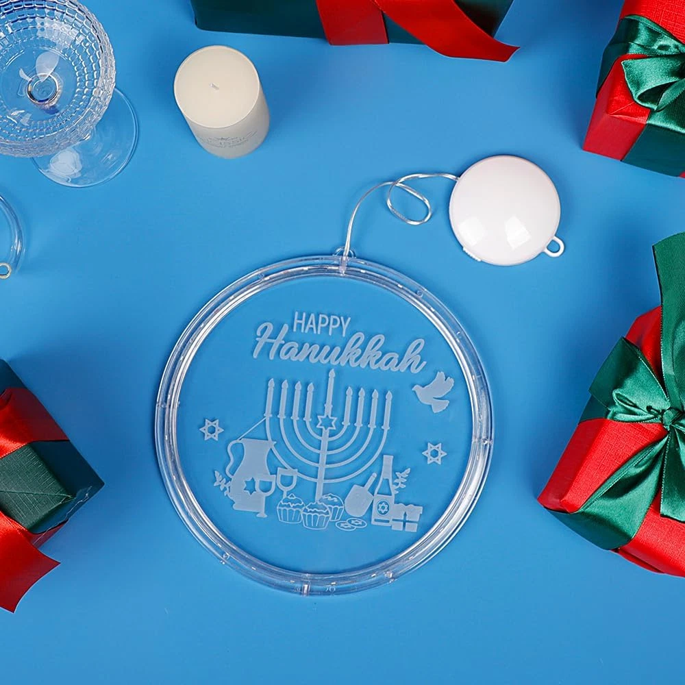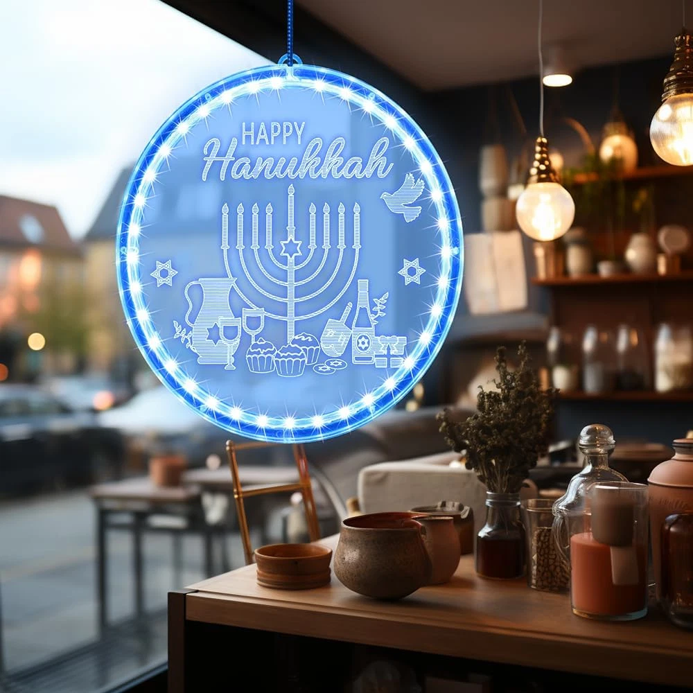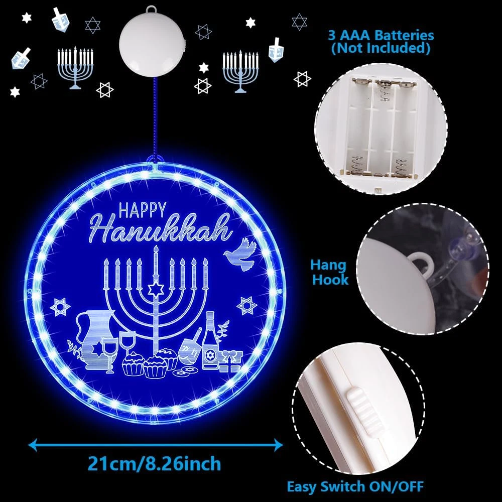 Menu Other Items Feedbacks About Us Contact Us Add To Favorites Hanukkah Decorations Blue Menorah Window Lights Battery Operated Chanukah LED Hanging Lights for Jews Judaism Synagogue Passover Shabbat Jewish Gifts Home Ornaments Indoor Outdoor Decor 🔵【Size】The diameter of the decorative lights is 8.26inch.The hanging rope and switch box, is approximately10inch. 🕎【Timeless Design Elements】Adorned with patterns and words that represent classic Hanukkah elements, these blue Chanukah lights infuse your Hanukkah gatherings or dining table with a rich Jewish ambiance. The vibrant blue light adds a dynamic touch to any space. ✡️【Quality Materials】Our decorative lights are expertly crafted from durable PVC materials, ensuring they remain sturdy and resistant to breakage even after long-term use. You can rest assured that they won't overheat. They're safe for children and pets, convenient to store, and can be reused for multiple occasions. 🕊️【Effortless Installation】The LED lights are accompanied by a suction cup hook, simplifying the installation process on glass, gates, cabinets, and other smooth surfaces. You can effortlessly adjust their height to fit your preferred location.Powered by 3 AAA batteries (not included) ❤️Please don't hesitate to get in touch with us if you encounter any quality issues with the product. There's no need to return it, as we can send you a replacement. Rest assured and enjoy your shopping experience. Product Description Specification Light Color: Blue Round Circle Color: Blue Size: 8.26 inch/ 21 cm Lighting Source: LED Lighting Operation: Battery Box Package Includes 1 x Hanukkah Window Light 1 x Suction Cup Hook Item Specification Item model number GMJ lights Light Source Type LED Room Type Bedroom Power Source Battery Powered Color Blue Included Components Battery Control Method Touch Model Number GMJ lights Base Material Glass Is Waterproof True Connectivity Technology USB Recommended Uses For Product Decoration Shade Material Glass, Polyvinyl Chloride Mount Type Ceiling Mount Package Dimensions 8.86 x 8.66 x 1.42 inches; 9.14 ounces Switch Type Slide Shipping FREE FREE SHIPPING We are always working hard to ensure your package arrives as soon as possible. Please understand that some factors like weather, high postal traffic, and the performance of shipping companies are outside of our control. We offer free shipping to the lower 48 states. We do not accept P.O. Boxes. Please provide a physical address. If you have a problem or question regarding your transaction please contact us immediately. We will work with you to resolve any problem you may have. Thank you