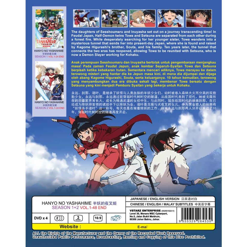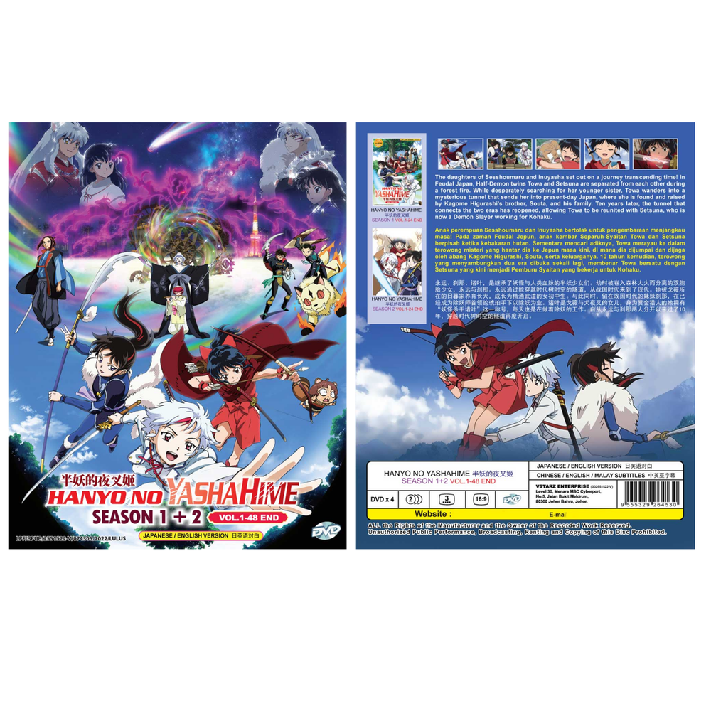 Hanyo no Yashahime Season 1+2 Synopsis The daughters of Sesshoumaru and Inuyasha embark on a journey that spans across time! In Feudal Japan, twin half-demon sisters Towa and Setsuna are tragically separated by a forest fire. In her desperate search for her younger sibling, Towa stumbles upon a mysterious tunnel that transports her to present-day Japan. There, she is discovered and raised by Souta Higurashi, Kagome’s brother, and his family. Ten years later, the tunnel reopens, allowing Towa to reunite with Setsuna, who has become a Demon Slayer under the leadership of Kohaku. However, to Towa's dismay, Setsuna seems to have no memory of her older sister. Alongside Moroha, the daughter of Inuyasha and Kagome, the three young women journey between the two eras, determined to uncover their lost past. 永远、刹那、诸叶,这三位继承了妖怪与人类血脉的半妖少女,展开了他们的时空冒险。 幼时被森林大火卷走的双胞胎姊妹,永远与刹那。永远通过一条能够穿越时空的隧道,从战国时代来到现代,被戈薇的弟弟—日暮家族抚养长大,成为一名精通武艺的初中生。而留在战国时代的妹妹刹那,已成为除妖师首领琥珀麾下的得力干将。 诸叶,作为犬夜叉与戈薇的女儿,身为一名赏金猎人,因“妖怪杀手”之名而闻名遐迩,每日忙碌于除妖之事。 十年后的今天,连接两个时代的时空隧道再度开启,永远与如今已来到现代的刹那重逢,但刹那竟然遗忘了与永远的往事。与她们同行的诸叶,以及这群“半妖的夜叉姬”们,跨越现代与战国时代,展开了一场揭开失落记忆的冒险。 Features and further details Hanyo no Yashahime ( Yashahime: Princess Half-Demon ) 半妖の夜叉姫 -戦国御伽草子 - Product Description: Season 1 + 2 Complete TV Series Volume 1 - 48 End Season 1: Volume 1 - 24 End Season 2: Volume 1 - 24 End NEW! English Audio Dubbed Version Optional: Japanese with English Subtitle Condition: Authentic Brand NEW, Original Factory Sealed Episode: Vol. 1 - 48 End No. of Discs: DVD x 4pcs Region Code: ALL Region, Region FREE "0" Able to play on DVD Players throughout the World Audio Language: English / Japanese Subtitles: English / Chinese / Malay Contact us Feel free to reach out to us anytime via eBay messages for any questions, comments, or product requests. We aim to respond within 24 hours and are here to assist you! We encourage our customers to get in touch with any inquiries or concerns to ensure your complete satisfaction with your purchase.Feel free to reach out to us anytime via eBay messages for any questions, comments, or product requests. We aim to respond within 24 hours and are here to assist you! We encourage our customers to get in touch with any inquiries or concerns to ensure your complete satisfaction with your purchase. Payment We happily accept all payment methods available through eBay, including credit cards, debit cards, PayPal, GPay, and more. Shipping We use USPS First Class for shipping, with an estimated arrival time of up to 5 business days. Our handling time is 1-3 business days. A valid tracking number will be provided, and your parcel will be carefully packed with bubble wrap to reduce the risk of damage during delivery. Return Our return policy adheres to eBay’s professional standards. Buyers protected by the eBay Money Back Guarantee are eligible for refunds in the following cases: damaged items, items not matching the description, or incorrect items. To initiate a refund, please provide evidence of shipping damage and retain the original packaging. If you no longer want the item, we accept returns as long as it is in the same condition as when it was shipped. Refunds will be processed minus the original shipping cost. Please return the item within the specified timeframe, ensuring all parts are included and the packaging is undamaged. Once we receive the item in satisfactory condition, we will issue a refund within 2 days. Returns that do not meet these conditions may not be accepted. Feedback We greatly value your feedback and appreciate your input. Your experience is important to us, so if there's any way we can improve, please reach out before leaving feedback. Our customers are our top priority, and we take your concerns seriously. We are dedicated to working with you to find a satisfactory resolution. Please contact us via eBay Messaging, including your contact information and order number. Thank you for choosing to shop with us! Thank you for choosing to shop with us!