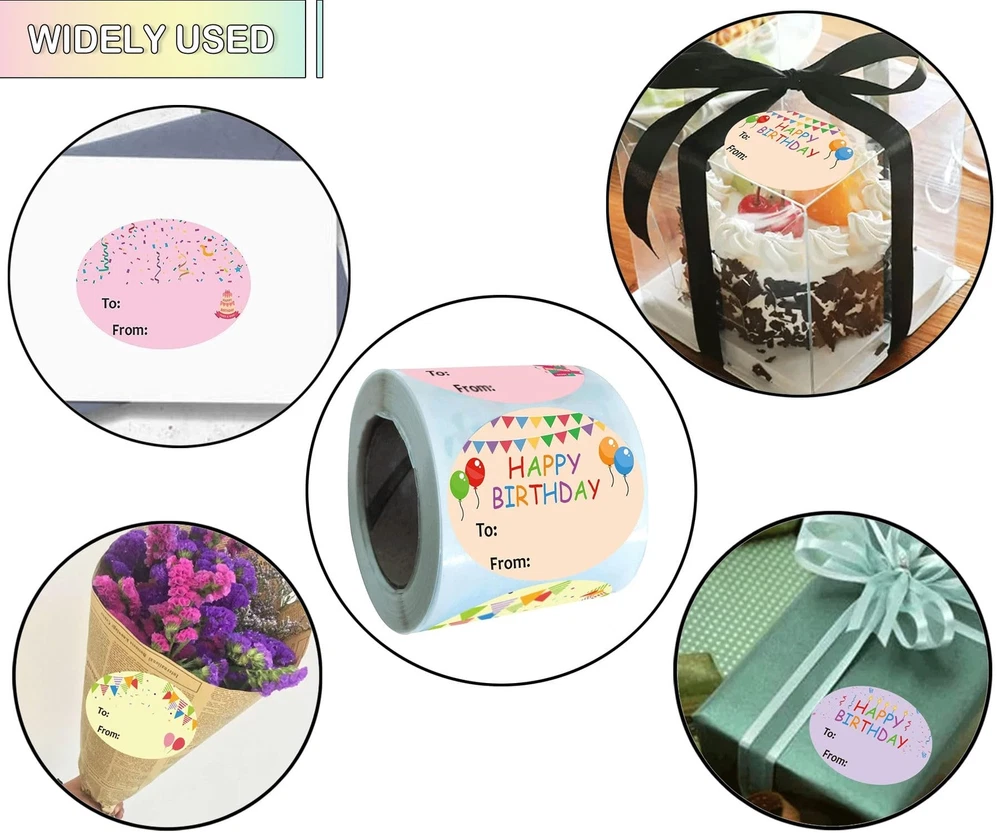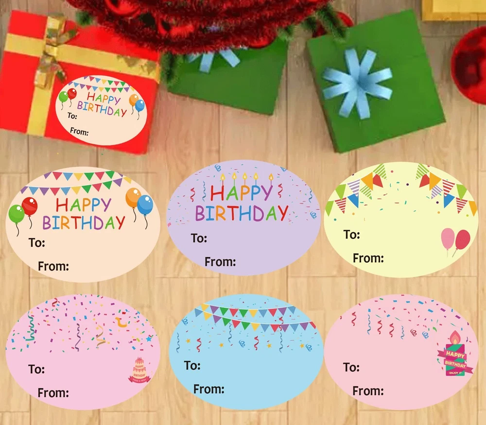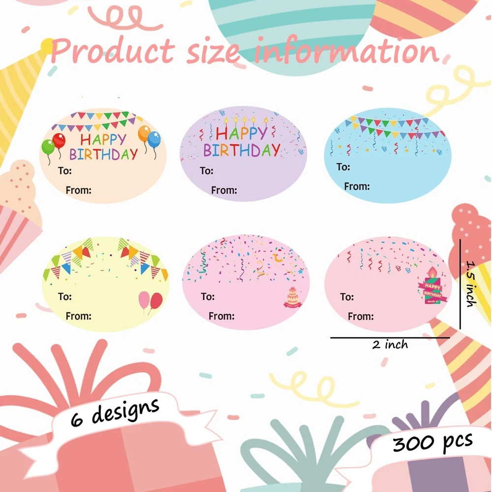 Happy Birthday Gift Tag Stickers for Presents. Each label size is 1.5 x 2 Inch. You will receive 300 adhesive birthday stickers. These happy birthday stickers are made of a semi-gloss paper material. Happy birthday labels printed text "From" "To" Plenty blank place for you to write on your name and receiver name using a pen or sharpie marker. Easy to peel off the roll and stick well on most smooth surface. Adhesive Happy Birthday Labels adhere to almost any flat surface including wrapping paper, poly bags, plastic, and even apparel or blankets. The adhesive will remove from fabric items without harming them. Stick on Birthday Labels. Perfect labels for birthday parties, themed parties, and many more! Stick well on birthday gifts, goody bags, gift boxes, treat bags and crafts with them, or pass them out during the party so your guests can decorate themselves. 🎉You will receive: 300 pcs 1.5x2 inch christmas holiday birthday stickers in sufficient quantity to meet your needs at birthday parties and holiday celebration parties 🎉6 designs: The Happy Birthday Gift Label comes in 6 unique designs, featuring lively and bright colors, as well as festive elements such as balloons, fireworks, candles, and birthday cakes, making it perfect for expressing your love and blessings to boys and girls 🎉High quality: The oval christmas colored gift stickers are made of high-quality paper material, with high adhesion that is not easy to peel off. There is a permanent adhesive on the back, which can be adhered to almost any flat surface, including packaging paper, polyethylene bags, plastic, and even clothing or blankets. The adhesive will be removed from the fabric and will not cause damage to the fabric. 🎉Writable blessings: The surface of the birthday gift sticker is made of semi glossy paper material. You can use a pen and marker to write down the names of yourself and your blessings in the blank space, passing on your love 🎉Best Gift Partner: Christmas Birthday Gift Label Sticker is your best choice for giving gifts. It is suitable for celebration venues such as birthday parties, themed parties, and holiday gatherings, and can be used to decorate gift boxes, gift bags, handicrafts, and candy bags