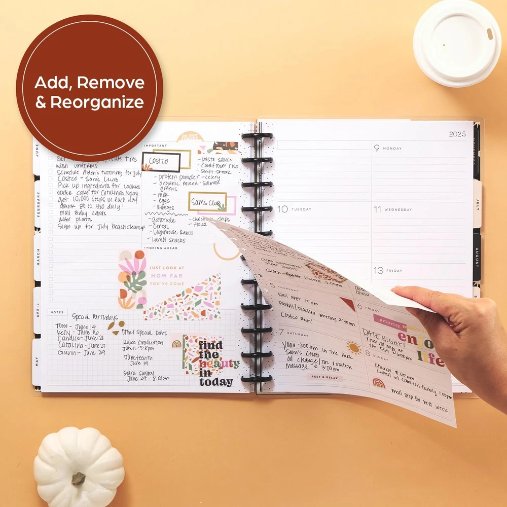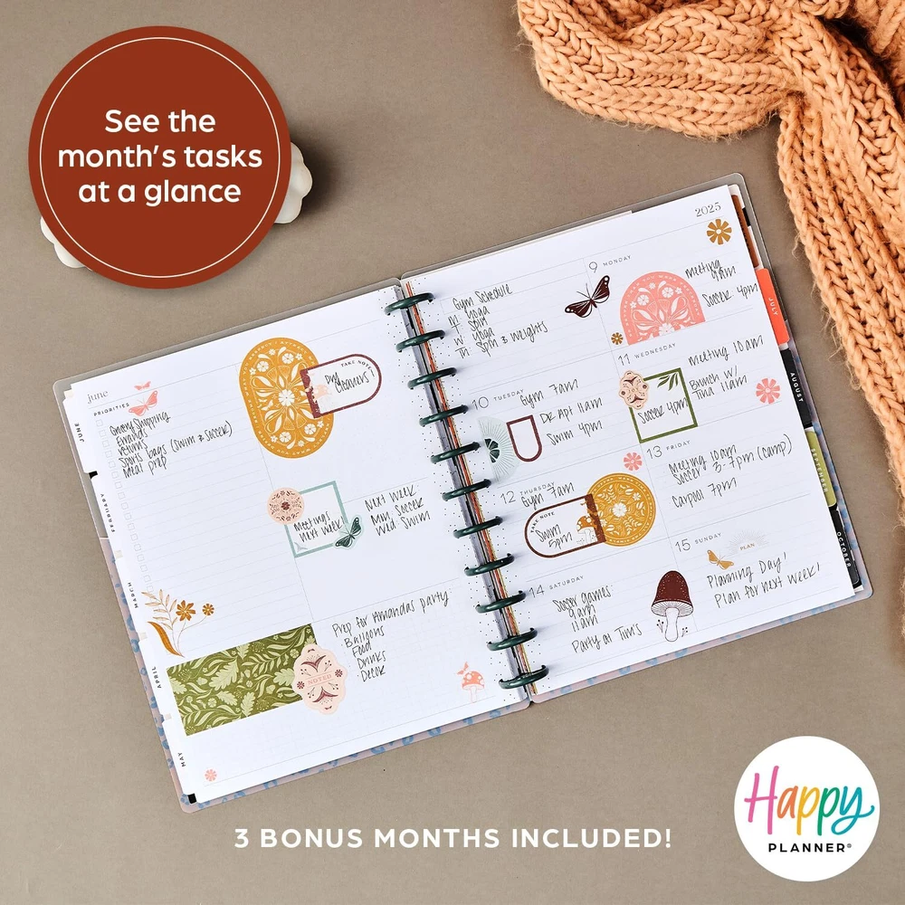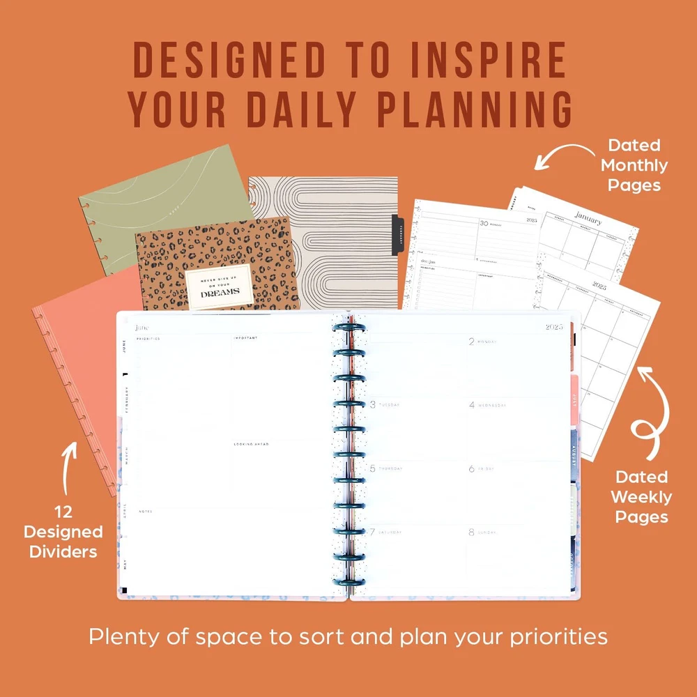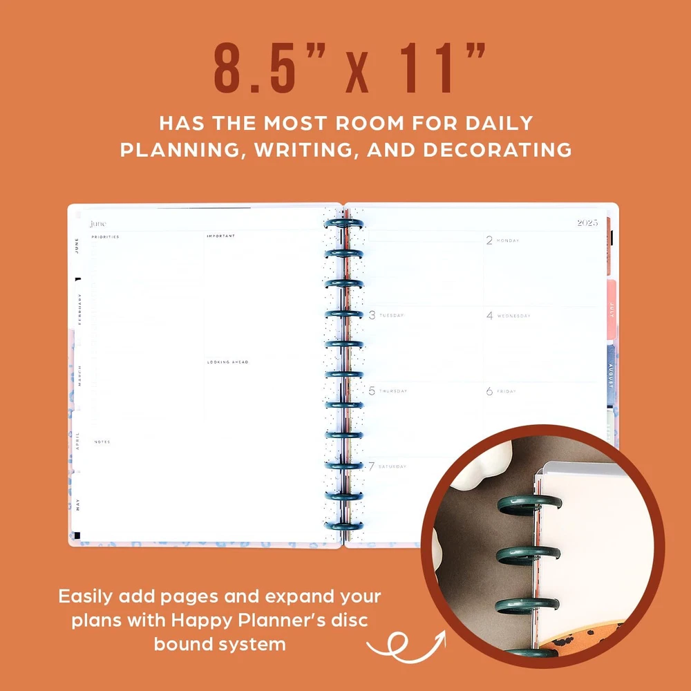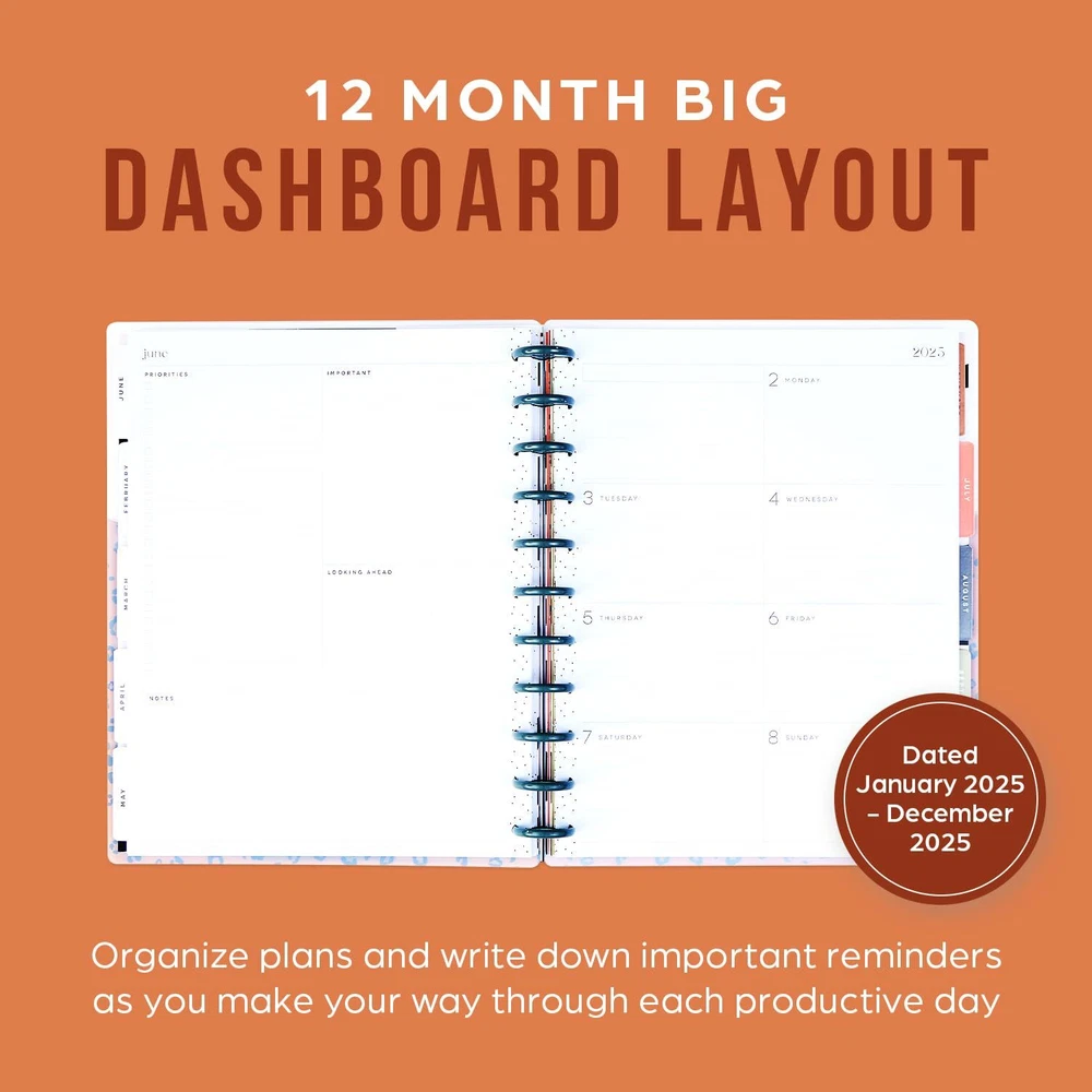 2025 PLANNER: Our 2025 big planner features animal-print designs and patterns. The big size has the most room for daily planning, writing, and decorating and is the perfect desk companion for school, work, or home. Write out your priorities and add stickers to personalize your spread! DASHBOARD LAYOUT: The dashboard design was created for list makers who like to see their weekly priorities at a glance. This 2025 calendar planner for school or work includes a section to list errands, grocery lists, bills, and to-dos, and the right side has boxed spaces for daily agenda reminders or plans. CUSTOMIZABLE: Make your agenda planner unique from the inside out. Our signature disc-bound spine allows you to add, remove, and rearrange pages. You can even change out the discs! Add stickers, pockets, and page markers to create a true-to-you piece. DESIGN: This 12-month tabbed weekly planner includes 12 months of calendars and weekly spreads, 3 bonus months, 2 sticker sheets, and premium-weight paper. The sturdy laminated covers protect the pages, and the plastic discs allow you to customize with accessories. OUR PROMISE: At Happy Planner, it’s our mission to spread happiness wherever we go, and we want to empower people everywhere to embrace the positive and Plan a Happy Life! With each purchase, you’ll get a little slice of joy that you can use every day.