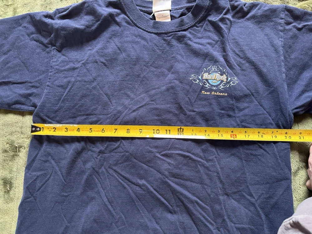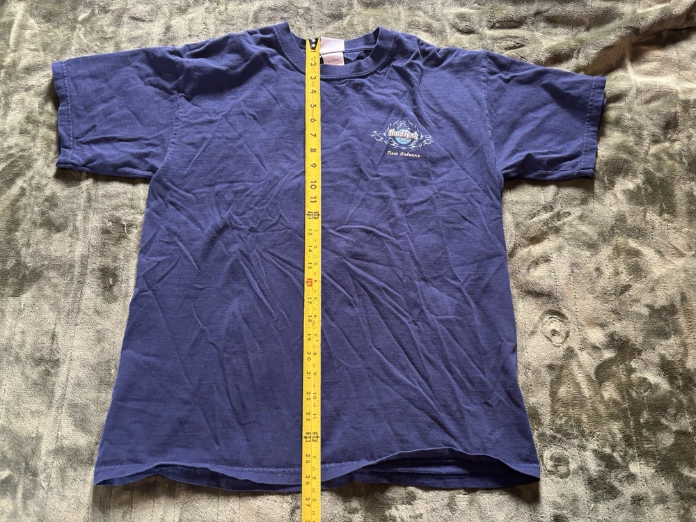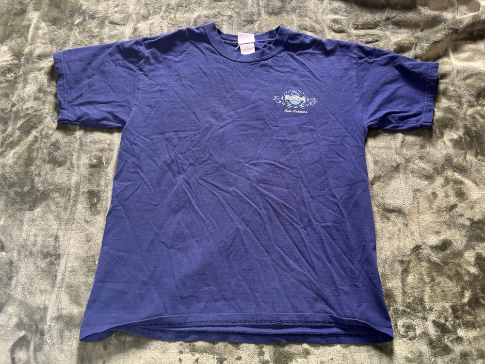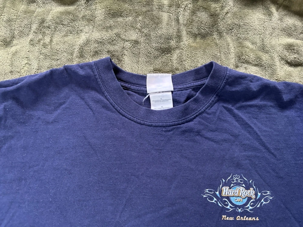 The product is a men's large blue vintage Y2K Hard Rock Cafe shirt featuring a graphic print of flames and a guitar from New Orleans. Made of cotton with a crew neckline and short sleeves, this regular fit t-shirt is machine washable and suitable for all seasons. The shirt has a rock and music theme, embodying the 90s aesthetic and representing the USA with its design and branding. Made in Honduras, this double-sided shirt is perfect for fans of Hard Rock Cafe and those who appreciate vintage music memorabilia.