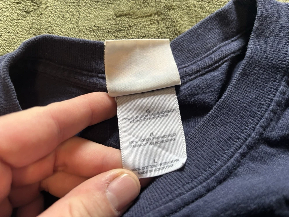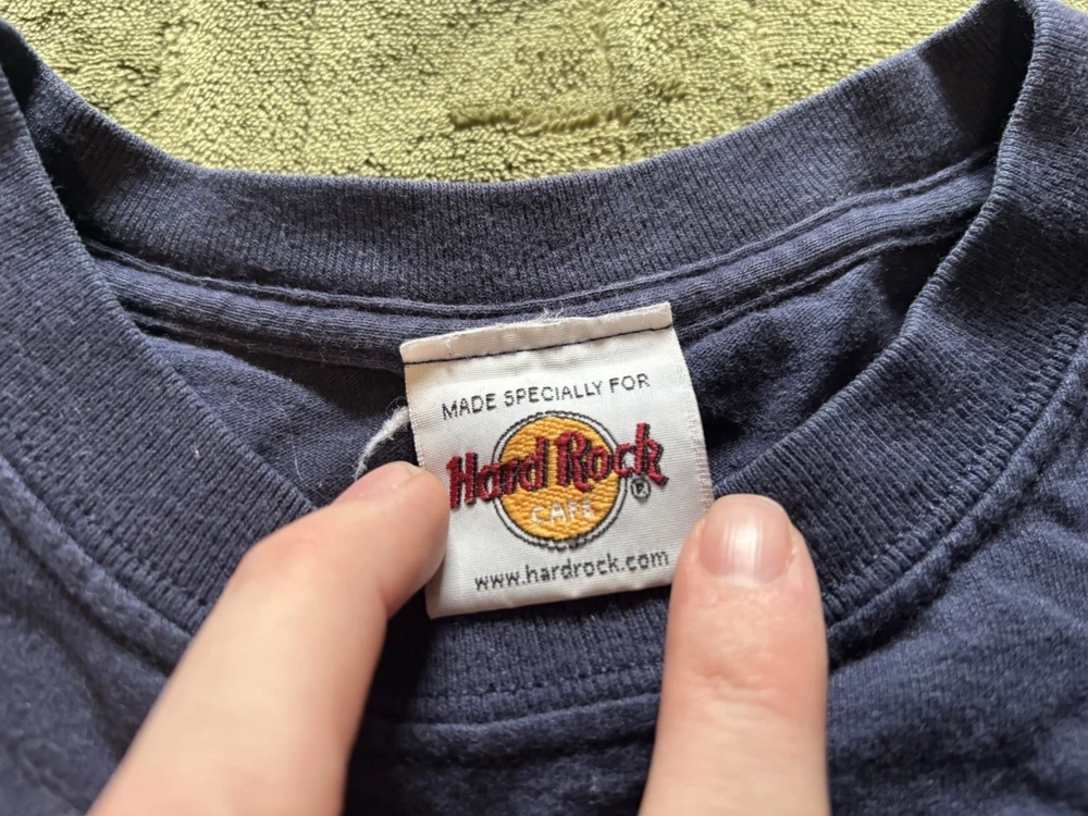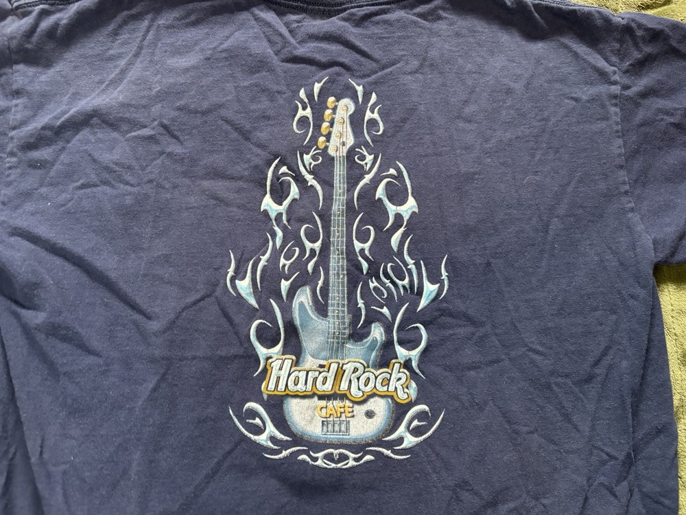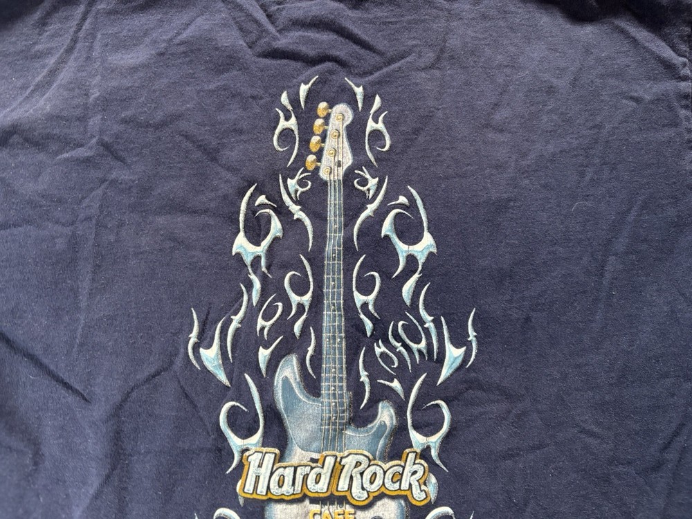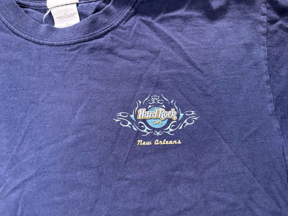 The product is a men's large blue vintage Y2K Hard Rock Cafe shirt featuring a graphic print of flames and a guitar from New Orleans. Made of cotton with a crew neckline and short sleeves, this regular fit t-shirt is machine washable and suitable for all seasons. The shirt has a rock and music theme, embodying the 90s aesthetic and representing the USA with its design and branding. Made in Honduras, this double-sided shirt is perfect for fans of Hard Rock Cafe and those who appreciate vintage music memorabilia.
