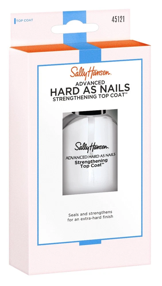 Hard as Nails®, Top Coat, Nail Strengthener, Nail Protectant Product Details STRENGTHENING - Nail treatment seals and strengthens your nails ADVANCED FORMULA - Prevents breaking and splitting with an extra-hard finish LONG LASTING - Long-lasting protention and shine HOW TO USE - Apply 1 coat over dry nail color to seal and strengthen HIGH SHINE - High shine finish We're making your nails strong beautiful with a high-shine extra hard finish that lasts with this nail treatment and top coat in one! Get your nails looking and feeling stronger with breakage prevention, plus the strength of Polymer Coating Technology™ over color to seal and strengthen. For strong nails and an extra hard manicure that lasts, apply 1 coat of Sally Hansen Advanced Hard as Nails Strengthening Top Coat™ to seal and strengthen at home. Item model number 74170451214 Number of Items 1 Color Transparent Product Dimensions 2.78 x 5.38 x 0.78 inches; 1.6 ounces Country of Origin USA Item Weight 1.6 Ounces Liquid Volume 13.3 Milliliters Item Form Gel Size 0.45 Ounce (Pack of 1) 5.38 inches x 2.78 inches x 0.78 inches. Weight: 1.6 oz Payment Details We accept all payments via Ebay using Credit Cards , PAYPAL , Apple Pay and many others Shipping Details We are always working hard to ensure your package arrives as soon as possible. Please understand that some factors like weather, high postal traffic, and the performance of shipping companies are outside of our control. Delivery & Return Policy Details We offer a 30-Day Return Policy on items in which you are not completely satisfied with. You have the option of a full-refund or an exchange of the item. No returns are available on items shipped outside of the USA.