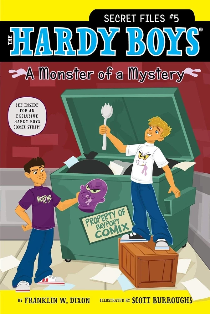 Hardy Boys Secret Files Series Books Choice from Books 5, 6, 7, 8 by Franklin W. Dixon Paperbook Details listed below First book is $5.99 and larger discount for each additional book you purchase. Book 5: A Monster of a Mystery When the actor who plays popular comic character Morpho the Morph Monster comes to town for a fan day--along with his famous Morpho Mask and Morph Spork--everyone, including Frank and Joe, is excited to meet the man behind the mask. But at the event, Morpho's Spork goes missing! And until the Spork is returned, the entire event will be put on hold! It's up to Frank and Joe to crack the case--and return the Spork to its rightful owner! Book 6: The Bicycle Thief It's time for the annual Junior Bike Race in Bayport, and Frank and Joe are the top contenders. Midway through the race, Frank runs over a nail and blows a tire. It seems as if the day couldn't get worse--until Frank's bicycle goes missing! Bayport's leading bully, Adam Ackerman, seems to be the prime suspect. But when he proves that he wasn't the bicycle thief, everyone turns out to be a potential culprit--even Mr. Mack's dog, Lucy! Can Frank and Joe crack the case and bring Frank's bicycle home? Book 7: The Disappearing Dog There's a new kid in town in Bayport, and Frank and Joe Hardy aren't really sure what to make of Max O' Malley, the Magician. Not only is he totally annoying, he claims that he can make anything--or anyone--disappear. Though Max wins over a bunch of his classmates, Frank and Joe remain skeptical--until Mrs. Briar's prized show dog, Charlie, suddenly disappears--and keeps on mysteriously diappearing and reappearing. Max quickly becomes the prime suspect, but is he really the one behind the strange occurances? Or is Max really as magical as he says he is? Book 8: Sports Sabotage Frank and Joe bring their detective skills to the athletic arena in this all-new Hardy Boys Secret Files mystery! It’s time for Field Day at Bayport Elementary and all the kids are excited! Whatever grade wins gets a pizza party, and the person with the highest personal score also gets a special prize. But when the field equipment is sabotaged the day before the events are supposed to start, it looks like Field Day might not happen after all—unless someone can find out who is behind the mess of ruined rackets, tangled jump ropes, and flattened balloons. Can Frank and Joe crack the case and save Field Day?