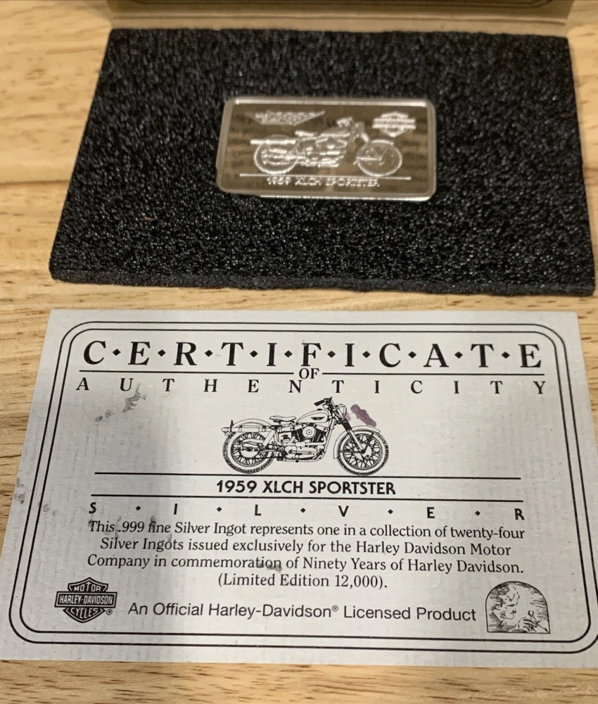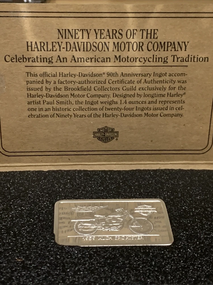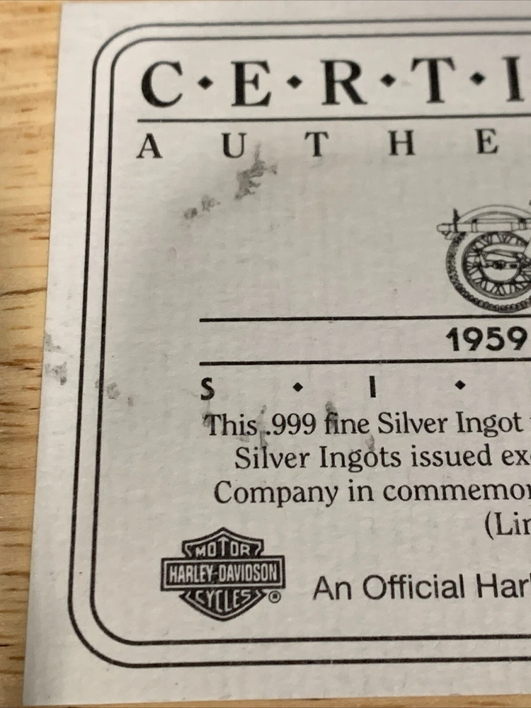 Comes in box/sleeve. Has certificate of authentication. Weighs 1.4 ounces and is .999 fine silver. An official Harley-Davidson Licenses Product. The brown sleeve has some small black & white marks on it. The CoA has some black marks on it. The bar has some scratches on it. Please review all pictures.