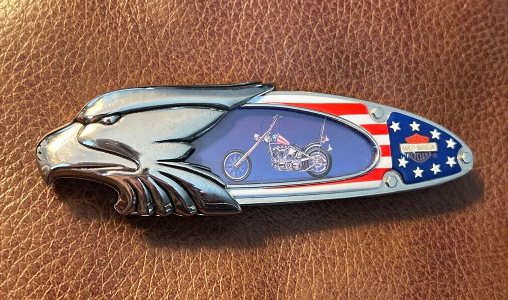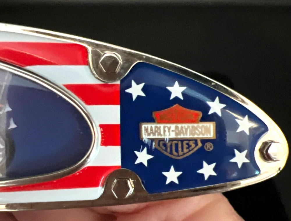 This Harley Davidson Series pocketknife by Franklin Mint is a must-have for any collector or fan of the iconic brand. The knife features a multi-colored handle and a plain edge stainless steel blade with a spear point. It is manually opened and has one blade. The handle is made of plastic and the knife is an original, not a reproduction. This knife is part of the Easy Rider Collector series and is perfect for display or use. The knife is a great addition to any collection and is sure to impress any fan of Harley Davidson. This knife has not been used and i in very nice condition I will pack with care and get it to you ASAP Thank you for looking !