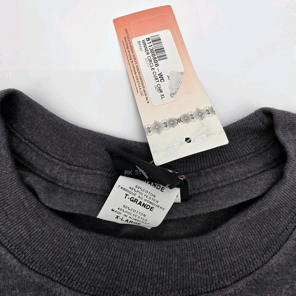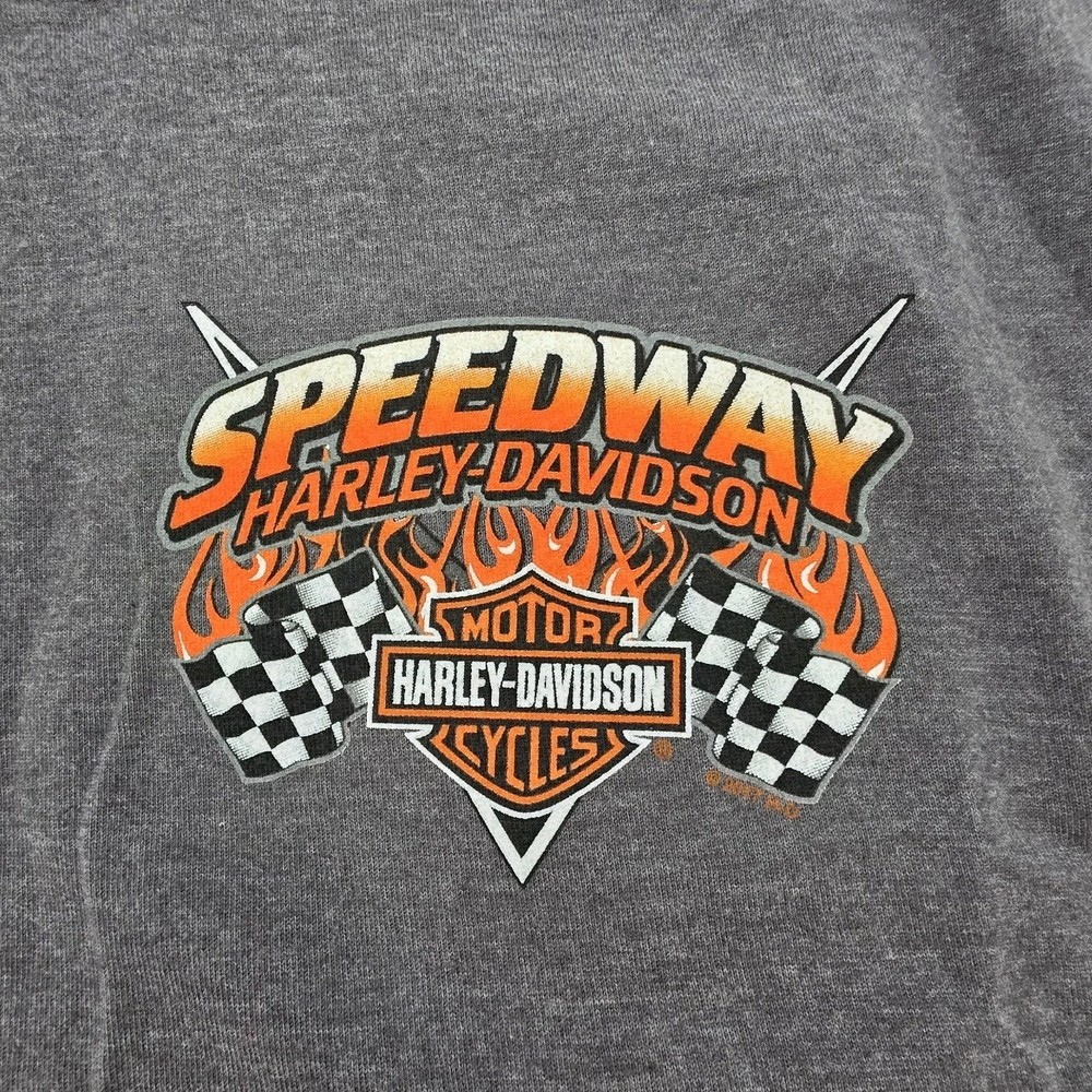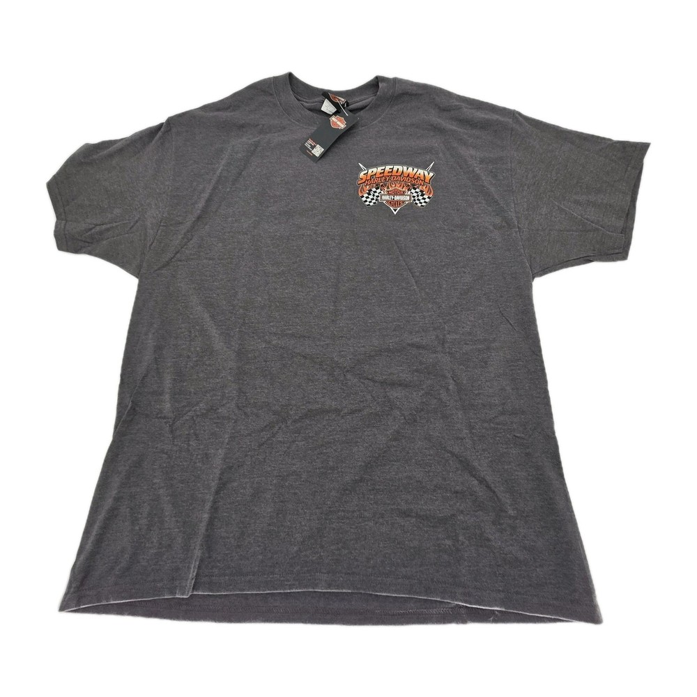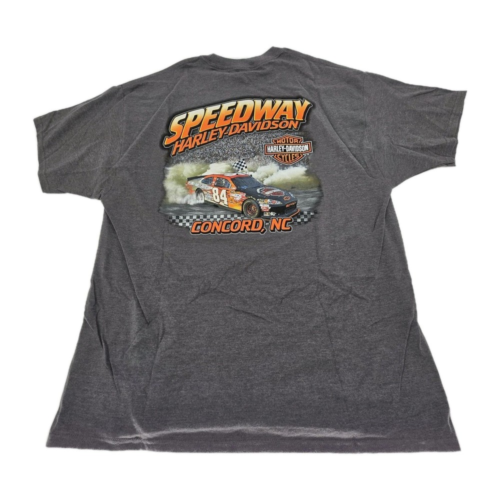 The New Harley Davidson Speedway Concord Men's Shirt in XL is a graphic print t-shirt featuring a design related to Charlotte Motor Speedway. Made from a blend of polyester and cotton, this shirt is machine washable and suitable for all seasons. The shirt has a crew neck, short sleeves, and a regular fit, making it comfortable for everyday wear. The gray color and logo accents give it a biker and USA-themed look, perfect for fans of Harley-Davidson and motorcycle culture. Veteran‑run store, fast shipping and good communication. Buy with confidence! Bin12/25