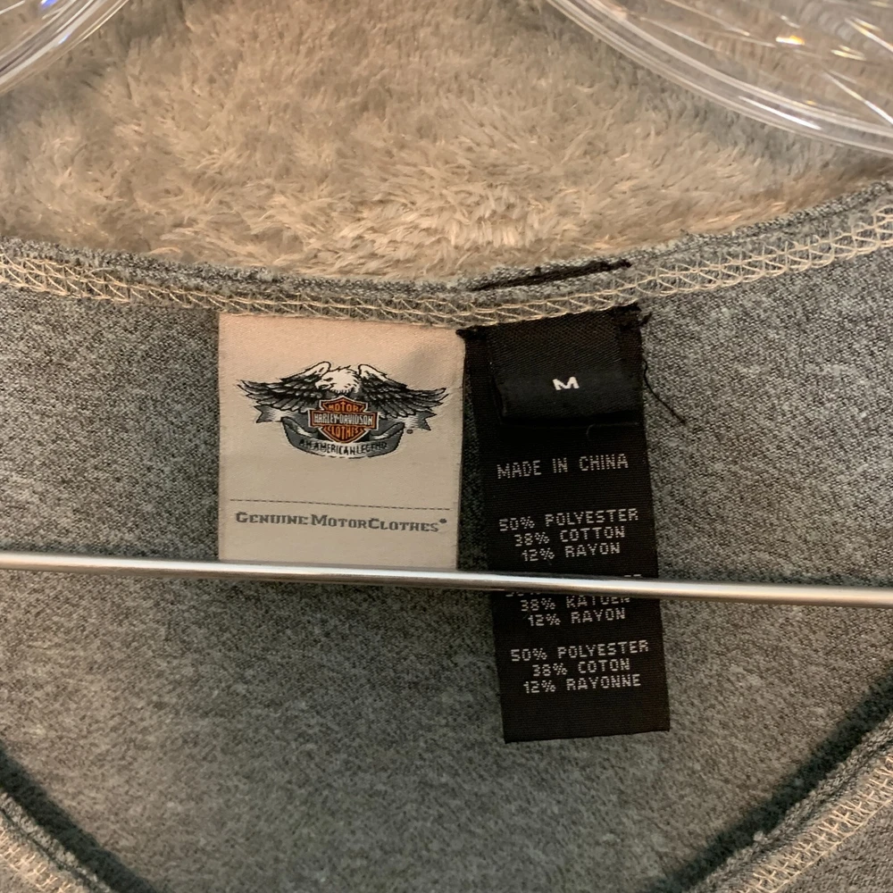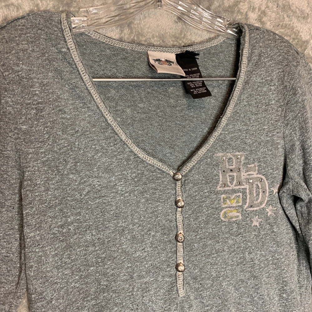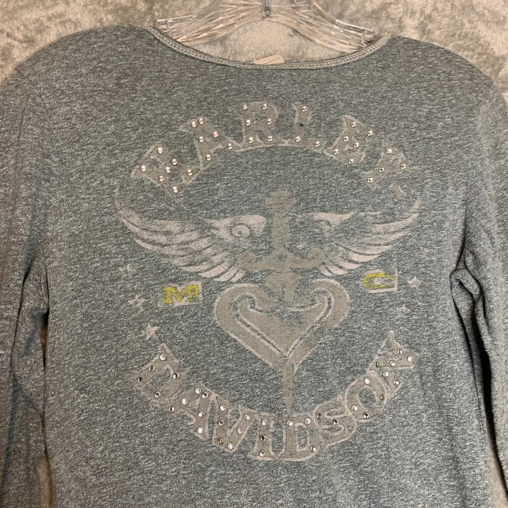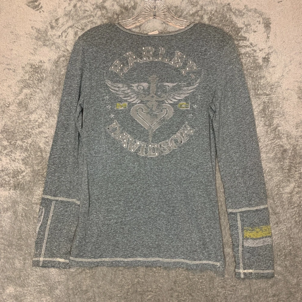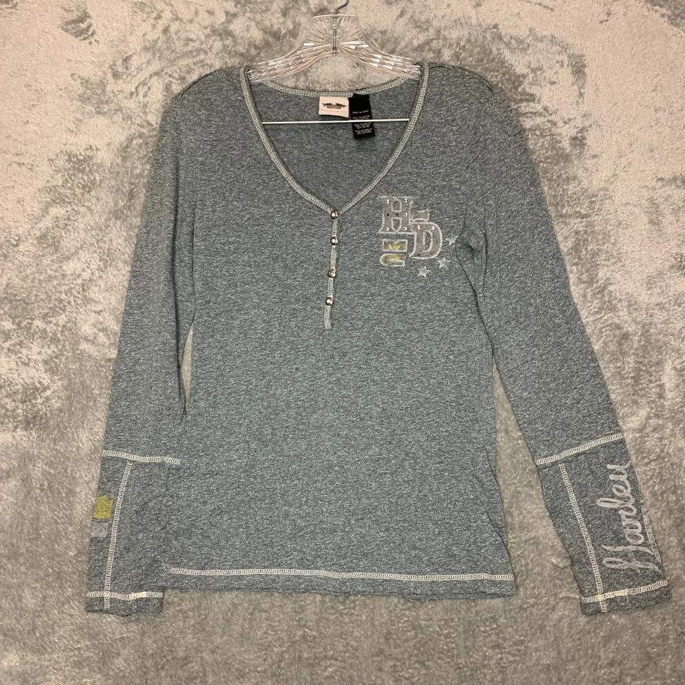 Good Pre Owned condition. There is some studs missing on the front logo and the back logo. Please see photos for details. SUPER FAST SHIPPING!!! We ship next business day! If you aren't happy with your purchase we offer 30 day FREE returns. No questions asked! Harley Davidson Women Studded Spellout Biker Long Sleeve Henley Thermal Shirt M