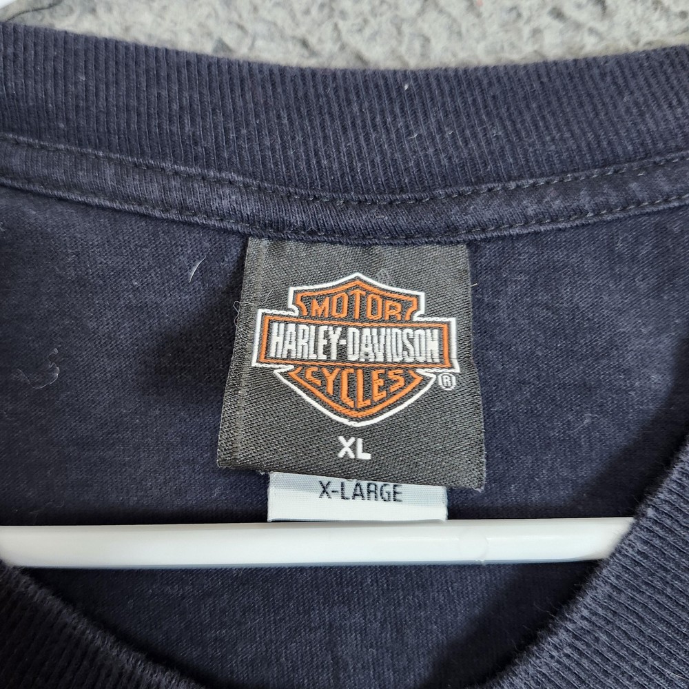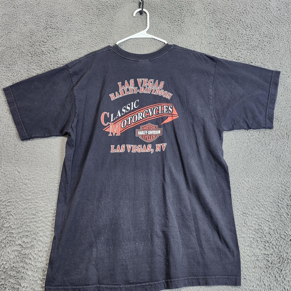 Brand: Harley-Davidson. Type: Mens short sleeve graphic shirt with crew neckline and regular fit. Color: Black. Tag size: XL (Mens X-Large). Material: Soft knit fabric; specific fiber content not visible on tags. Front design features a large bald eagle head above bold HARLEY-DAVIDSON lettering filled with an American flag pattern. Below the main logo is a red banner reading FREEDOM with the classic Harley-Davidson Motor Cycles bar and shield emblem. Back design reads LAS VEGAS HARLEY-DAVIDSON CLASSIC MOTORCYCLES LAS VEGAS, NV with another bar and shield logo and red script accents. Details: ribbed crew neck, short sleeves, straight hem, soft broken-in feel, patriotic eagle and USA flag theme ideal for Harley-Davidson motorcycle and Americana fans. Note: Shirt shows light overall fading, wash wear, and some lint from prior use as shown in photos; graphics remain bold with fabric and seams intact.