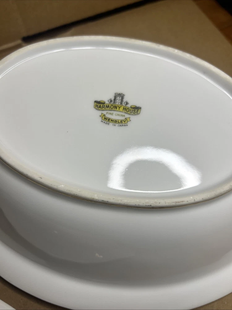 This is a vintage Harmony House fine china set from the 1960s, made in Japan. The set includes an oval serving plate and a serving bowl, both featuring a flower pattern. The pieces are made of porcelain in a multicolor design. They are part of a vintage collection and are ideal for serving food in a stylish and elegant manner.both pieces are in excellent shape