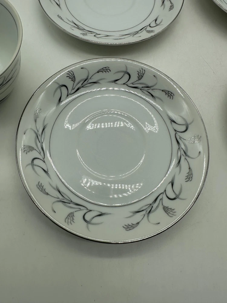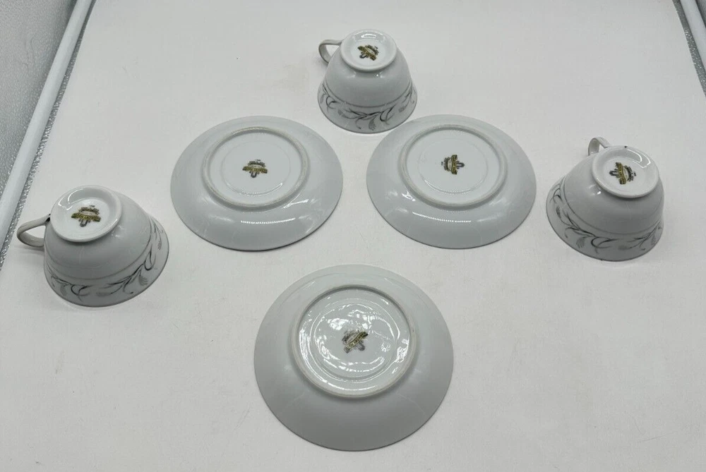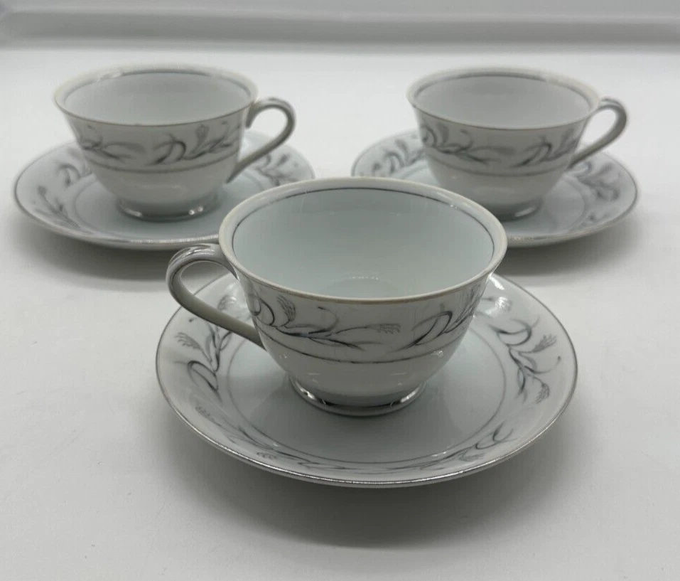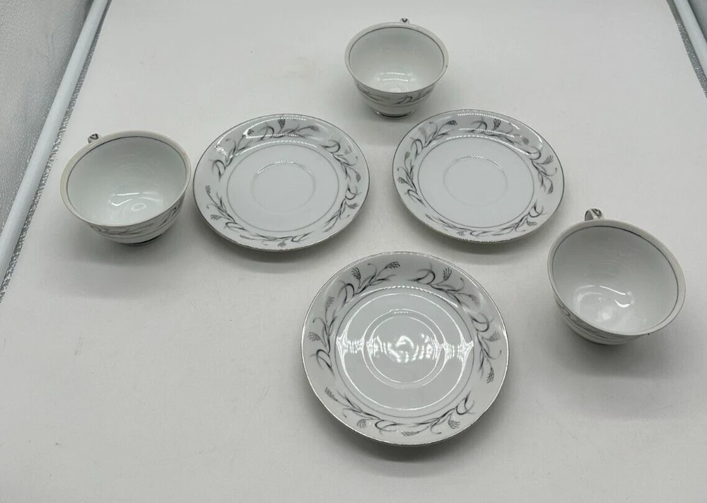 This set includes 3 vintage Harmony House Platinum Garland teacups and saucers made of silver bone china. The design is embossed with a Victorian style and a theme of magic. Each teacup has a 6-ounce capacity and features a decorated pattern. This original set, manufactured in the 1950s in China, is a beautiful addition to any tea lover's collection.