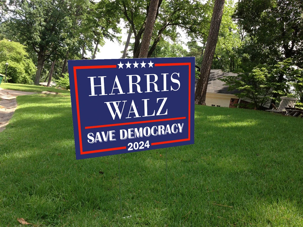 Harris Walz 2024 Yard Sign Double-sided Dimensions : 12x18 inches, perfect for visibility without overwhelming your yard or space. Material : Durable Coroplast, weather-resistant and designed for outdoor use in various climates. Design : Bold, legible text: "Harris Walz 2024" in prominent, eye-catching font. Secondary message: "Save Democracy" in a slightly smaller font to emphasize the campaign’s core message. Color scheme: Patriotic colors (e.g., red, white, and blue) to reflect the American spirit. Versatile Use : Ideal for lawns, gardens, or as a display in windows and public spaces. Easy Installation : Includes metal H-stakes for quick and secure placement in grass or soil. Purpose : Show your support for the Harris Walz 2024 campaign and the movement to protect democratic values.