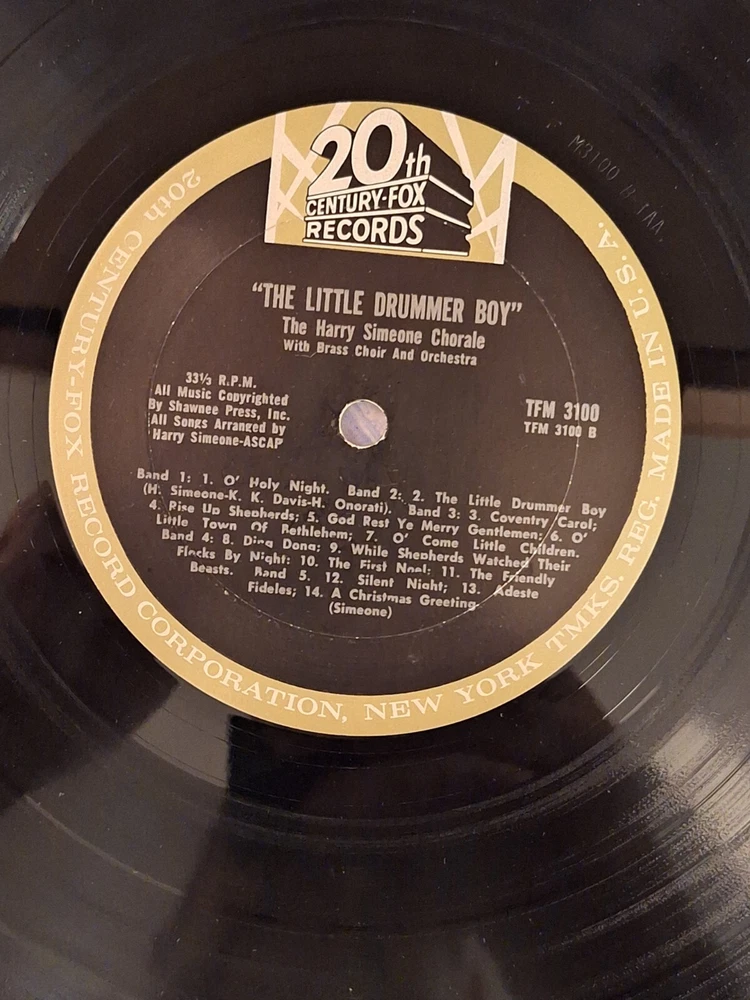 Era:VintageUPC:Does not applySeller Notes:“Plays Well”Country/Region of Manufacture:United StatesLanguage:EnglishFormat:RecordRelease Year:1963Release Title:The Little Drummer BoyType:LPRecord Size:12"Genre:Holiday - ChristmasSleeve Grading:Very Good Plus (VG+)Record Label:20th Century RecordsArtist:Harry Simeone ChoraleMaterial:Vinylgtin13:Does not applyStyle:Chorale, ChristmasCase Type:Cardboard SleeveRecord Grading:Very Good Plus (VG+)Inlay Condition:Very Good Plus (VG+)Features:Original CoverColor:BlackSpeed:33 RPM