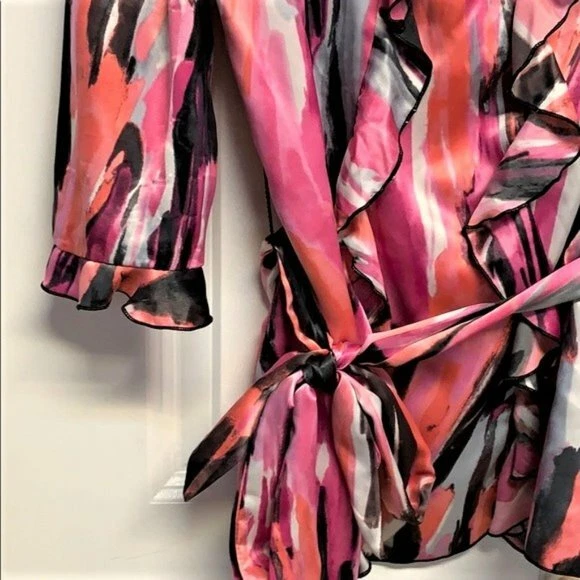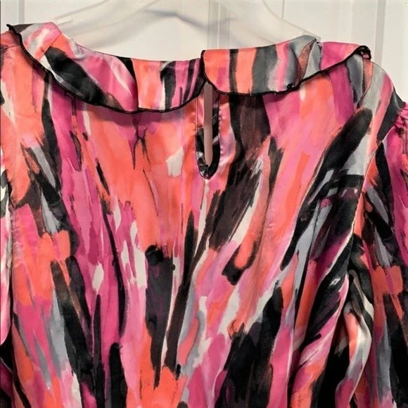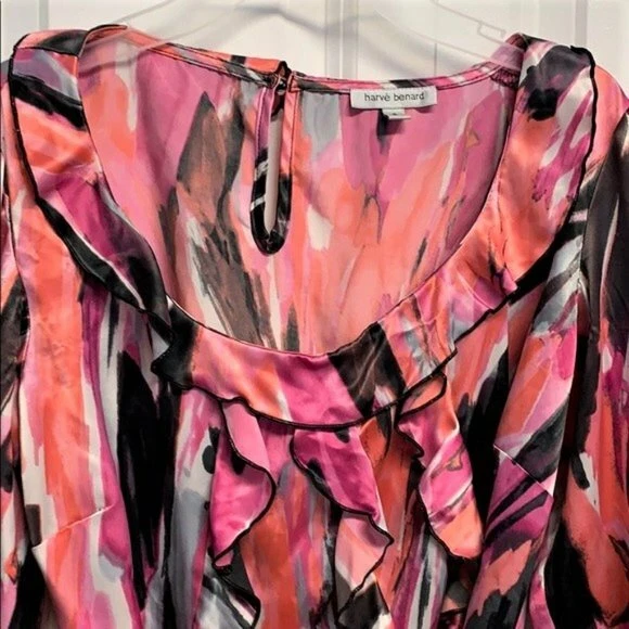 This Harve Bernard blouse is perfect for any occasion from work to party or casual wear. The boat neck and mid-sleeves give it a classic look while the ruffle and bow accents add a touch of fun. Made of high-quality satin fabric, the colorful design is perfect for summer, fall, or spring. The top comes in size S, with a belted feature that accentuates the waistline. The blouse is easy to wear, with a pullover closure, and requires hand washing only for garment care. The blouse is designed with a colorblock pattern and is ideal for those who love bohemian, punk, or hippie themes. This is a wardrobe staple for any fashion-forward woman. Some fabric distortion on sleeves other than that good preowned Condition 100% shiny satin polyester hand wash 15’ across shoulders 15.50’ long sleeves Ruffle cuff 18.50’ across chest 42’ around bottom 25’ long from collar seams to bottom front removable belt buttons in the back