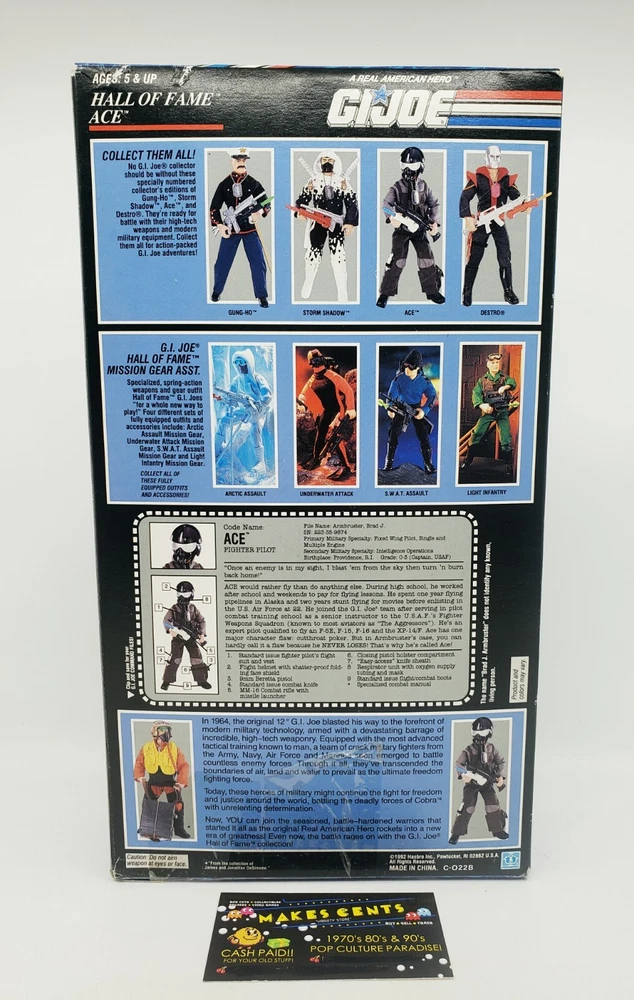 This is a vintage 1992 G.I. Joe Ace action figure, still in its original packaging and never opened. The figure is a collector's edition and comes with an assault rifle, helmet, and a box. It is a 1:06 scale model, manufactured in China by Hasbro. The figure belongs to the Hall of Fame series and is a must-have for any G.I. Joe fan. It is recommended for ages 5 and up and is perfect for all occasions. This rare item is very hard to find and is an original, licensed reproduction. Don't miss out on the chance to add this piece of war history to your collection. There are some minor creases but boxes never been opened, see pics