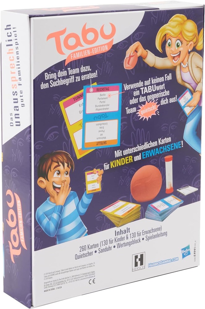 Further Details Title: Hasbro Taboo Kids vs. Parents Children & Adults Condition: New Brand: Hasbro Gaming Material: Plastic Theme: Trivia Release Date: 01/01/2020 Age Level: 8 years and up Min. Number of Players: 1 Item Length: 51mm Item Width: 200mm Item Height: 267mm Type: Board Games MPN: 315-E4941100 Description: Hasbro compatible Tabu Familien Edition E4941100 Item Weight: 200g Color: Multicolor Language: French, German Age Level: 8+ Hasbro TABOO - Tabu Familien-Edition, Brettspiel ab 8 Jahren Missing Information? Please contact us if any details are missing and where possible we will add the information to our listing.