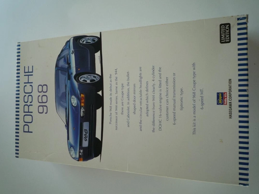 Hasegawa 1/24 Porsche 968 Plastic Model Limited Edition 20259 Hasegawa 1/24 Porsche 968 Plastic Model [Hasegawa] Porche Blue Brand new and unopened, but the box is dirty and scratched. Everything shown in the photo is included. Other accessories: JAN: 4967834202597 Size: 8x21x36 500 g Payment is due within 5 days after the auction ends. Shipping Normally, items are shipped within 5 business days after payment is received. Shipping times vary by country or region. Packages are shipped by FedEx. Items arrive in approximately 8-12 days after shipping to the continental US. For areas outside the US, we ship by FedEx Expedited Shipping and arrive in approximately 2-5 days after shipping (additional fees may apply. International Buyers - Import duties, taxes, and fees are not included in the item price or shipping cost. These charges are the buyer's responsibility. Please check with your country's customs office for more information.