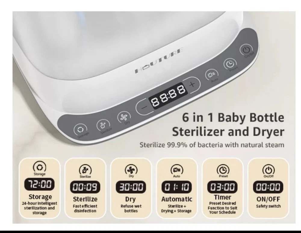 Introducing the Hauture Baby Bottle Sterilizer and Dryer, a 6-in-1 electric steam sterilizer that makes bottle feeding a breeze. With a powerful 650W motor, this sterilizer is perfect for parents who want to keep their baby healthy and happy. Designed specifically for baby bottles, this sterilizer is easy to use and reduces the risk of contamination. Plus, it comes with a dryer function that ensures your baby's milk or formula is warm and ready to drink. Whether you're a busy parent or just starting out, the Hauture Baby Bottle Sterilizer and Dryer is a must-have for any baby feeding routine.
