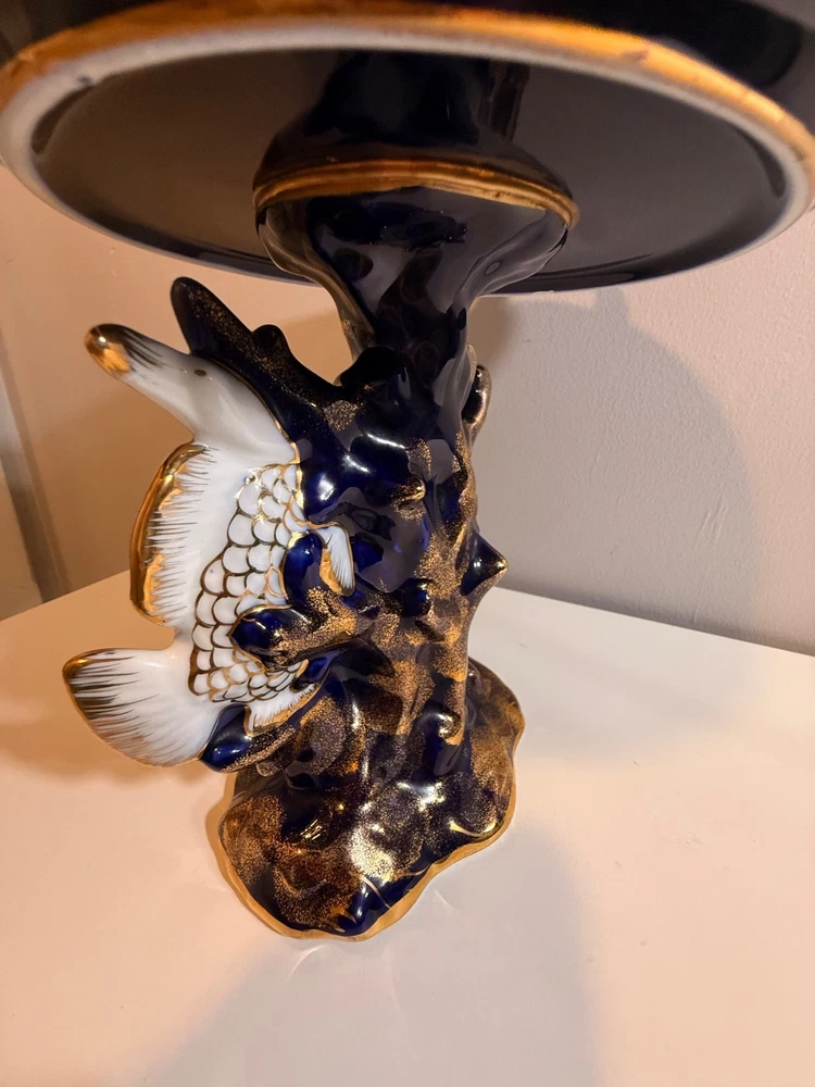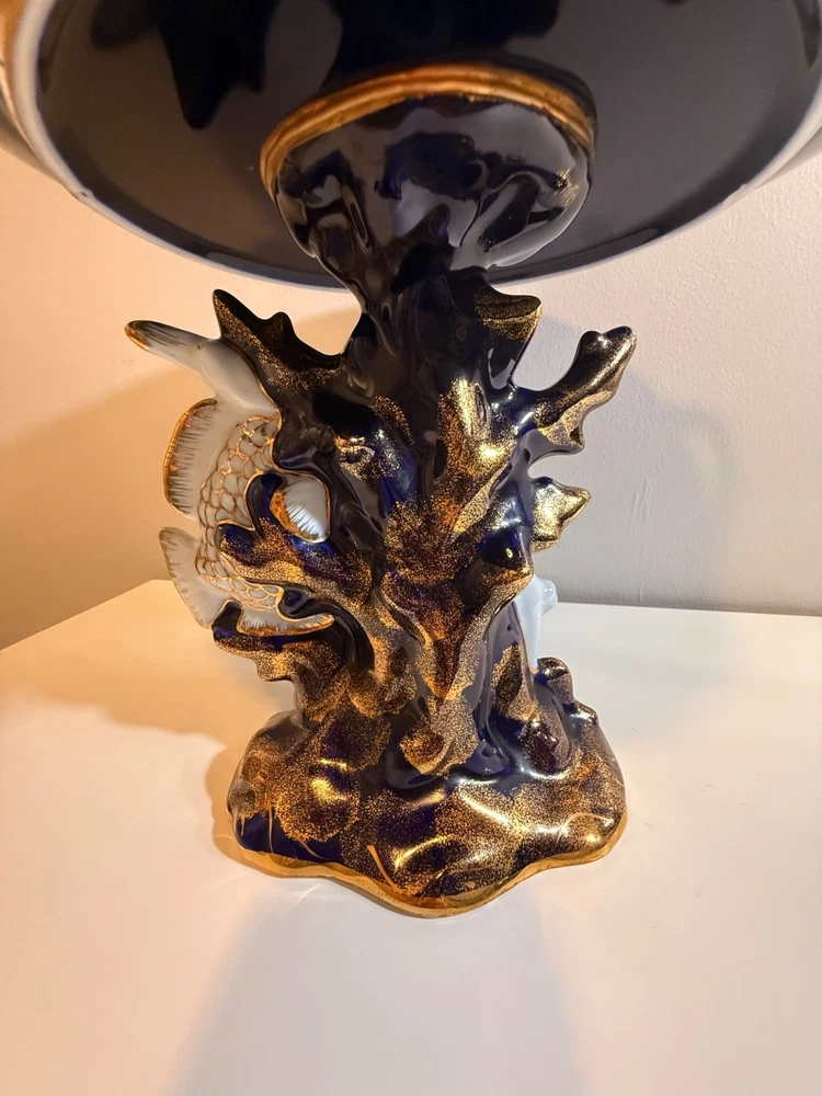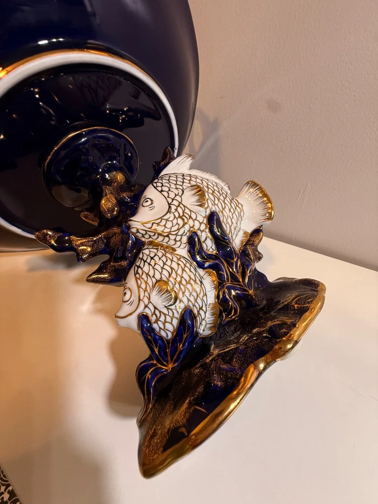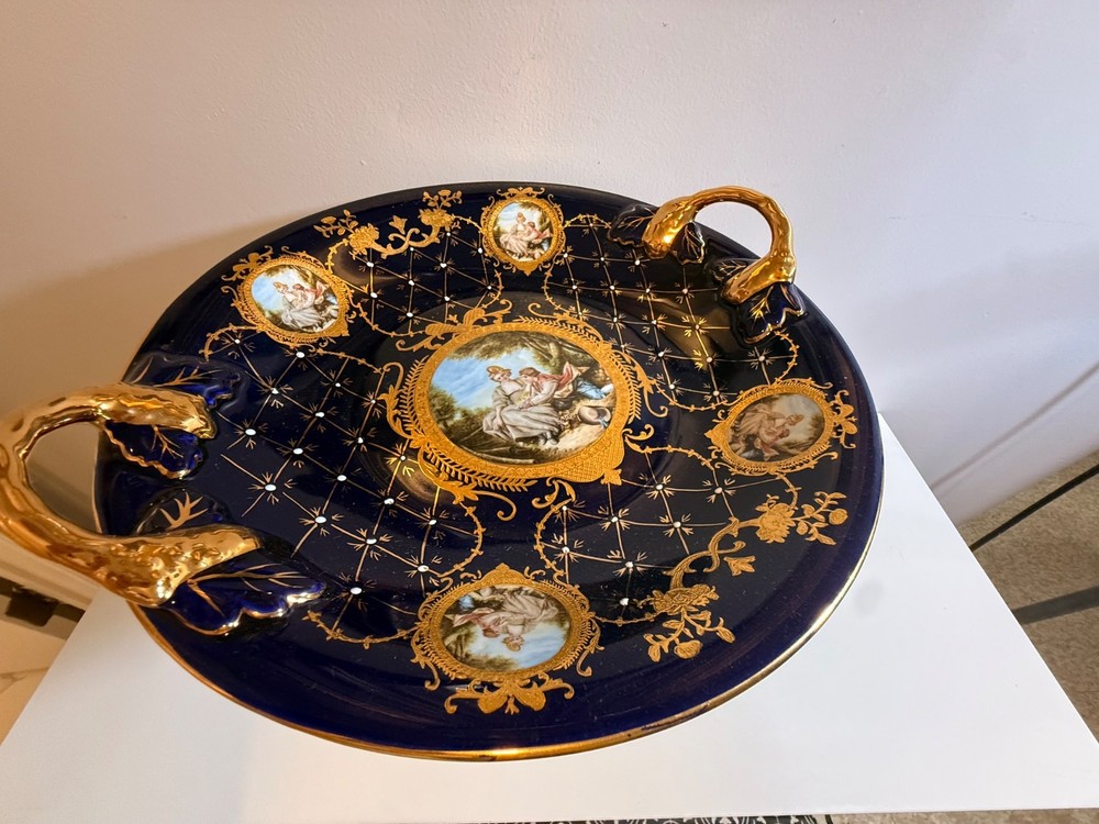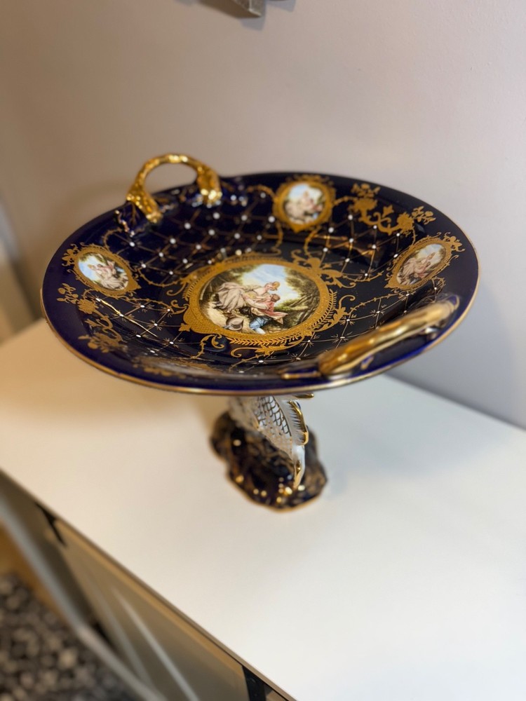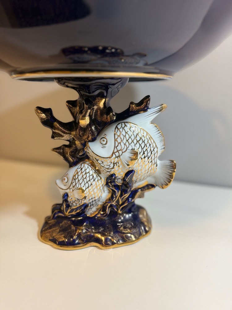Beautiful large Haviland Limoges footed centerpiece bowl in deep cobalt blue with raised gilt decoration. This is a striking and unique decorative porcelain piece with figural medallions and applied gilt fish motif. ✅ Brand: Haviland Limoges ✅ Origin: France ✅ Period: Mid–late 20th century (verified by independent appraisal) ✅ Condition: Very good; no cracks, chips, or repairs ✅ Size: approx. 10” tall × 20” diameter ✅ Mark: Script “Limoges France” underneath ✅ Appraisal: Includes fair-market value and authenticity information This bowl is ideal for display as a centerpiece or as a collector’s item. Please review all photos — they show the piece accurately. Ships insured and securely packed.