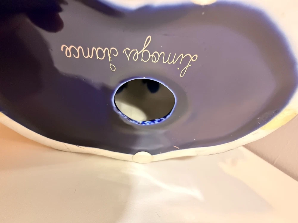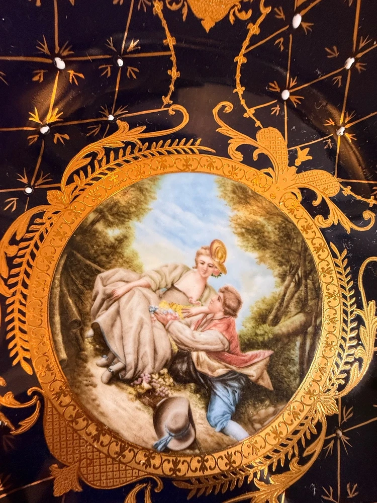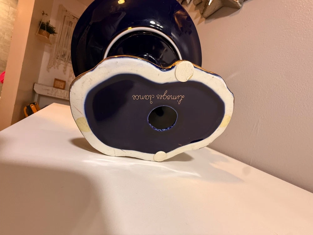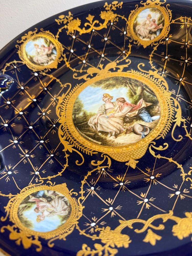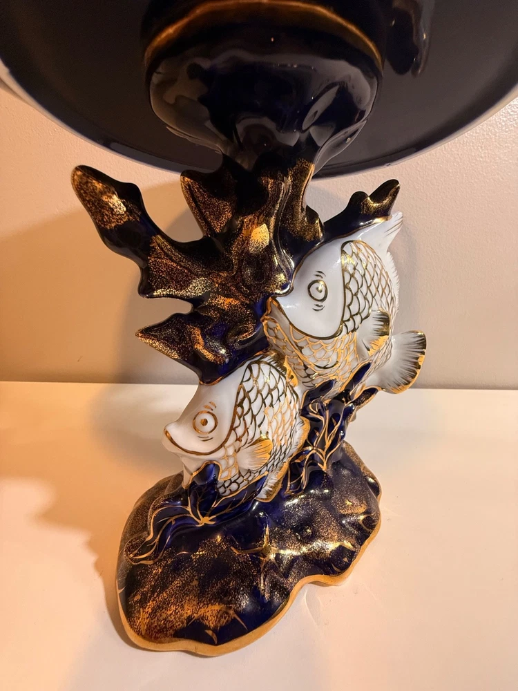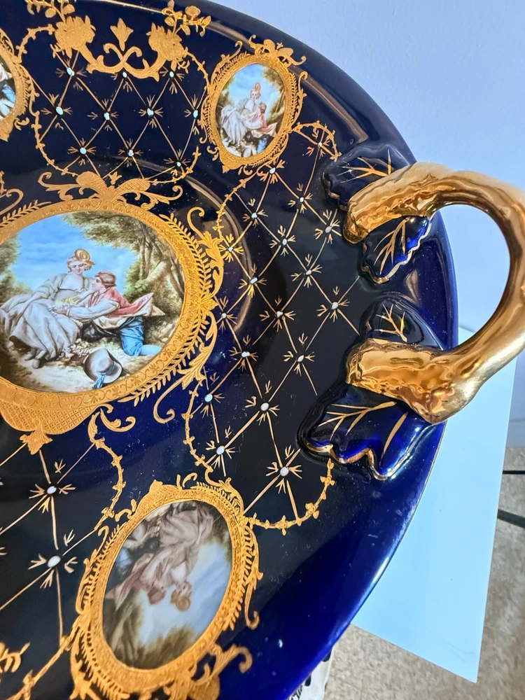 Beautiful large Haviland Limoges footed centerpiece bowl in deep cobalt blue with raised gilt decoration. This is a striking and unique decorative porcelain piece with figural medallions and applied gilt fish motif. ✅ Brand: Haviland Limoges ✅ Origin: France ✅ Period: Mid–late 20th century (verified by independent appraisal) ✅ Condition: Very good; no cracks, chips, or repairs ✅ Size: approx. 10” tall × 20” diameter ✅ Mark: Script “Limoges France” underneath ✅ Appraisal: Includes fair-market value and authenticity information This bowl is ideal for display as a centerpiece or as a collector’s item. Please review all photos — they show the piece accurately. Ships insured and securely packed.
