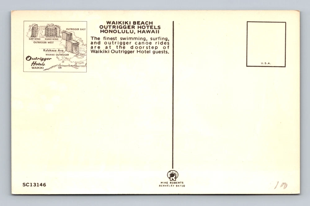 Hawaii HI Honolulu Waikiki Beach Outrigger Hotels Vintage Postcard Card View PC