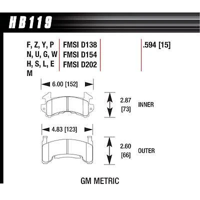 Home about us feedback view all listings contact us Shop by category: Brake Rotors Brake Pads Wheel Bearings Performance Parts Individual Wheels Wheel Rim Kits Wheel Rim Kits with lug nuts Driveshaft Wiper Linkages Steel Wheels HAWHB119G594 by HAWK BRAKE Brake Pads, DTC-60 Compound, High Torque, High Temperature, GM Metric Caliper, Set of 4 2 Year Warranty Estimated USA Ship Date: Today Estimated Canada Ship Date: Today Estimated International Ship Date: Today Specifications Compound DTC-60 Hawk Pad Shape HB119 Performance Friction Pad Shape 154 Recommended Operating Temperature Maximum 1100 Degrees Fahrenheit Torque Rating High Pad Width Inner (mm) 152 mm Pad Height Inner (mm) 73 mm Overall Thickness Inner (mm) 15 mm Pad Width Outer (mm) 123 mm Pad Height Outer (mm) 66 mm Overall Thickness Outer (mm) 15 mm Number of Pads Included 4 Quantity Kit FSMI Pad Shape D138 | D154 | D202 Wilwood Pad Shape D154 Recommended Operating Temperature Minimum 700 Degrees Fahrenheit Maximum Operating Temperature 1600 Degrees Fahrenheit Pad Width Inner (in) 6 in Pad Height Inner (in) 2.87 in Overall Thickness Inner (in) 0.594 in Pad Width Outer (in) 4.83 in Pad Height Outer (in) 2.6 in Overall Thickness Outer (in) 0.594 in Hardware Included No Universal Yes Note Designed to be used with Iron / Metal Rotors Global International Customers Shop with Confidence and Trust Us for a Positive Experience, Delivered Right to Your Door! Global Shipping with Trusted Carriers Experience reliable international delivery with our trusted partners Competitive Shipping Rates Take advantage of our highly competitive shipping rates, ensuring you get the best value for your money. Proper Customs Documentation Enjoy a hassle-free shipping experience with all necessary customs documentation prepared for you. Live Agents Available to Help Get immediate assistance from our live agents, ready to help you with any questions or concerns. Copyright 2024 All rights reserved.