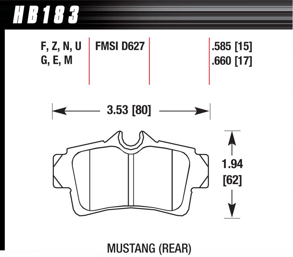 eBay Product Listing Brake Pads, HPS Compound, High Torque, Rear, Fits Ford Mustang 1994-2004, Set of 4 Product Details ▼ Compound HPS Hawk Pad Shape HB183 Recommended Operating Temperature Maximum 500 Degrees Fahrenheit Pad Width Inner (in) 3.53 in Pad Height Inner (in) 1.94 in Overall Thickness Inner (in) 0.585 in Pad Width Outer (in) 3.53 in Pad Height Outer (in) 1.94 in Overall Thickness Outer (in) 0.585 in Intended Location Rear Number of Pads Included 4 Quantity Set of 4 FSMI Pad Shape D627 Recommended Operating Temperature Minimum 100 Degrees Fahrenheit Maximum Operating Temperature 700 Degrees Fahrenheit Pad Width Inner (mm) 80 mm Pad Height Inner (mm) 62 mm Overall Thickness Inner (mm) 15 mm Pad Width Outer (mm) 80 mm Pad Height Outer (mm) 62 mm Overall Thickness Outer (mm) 15 mm Hardware Included No OEM Application Yes Note Designed to be used with Iron / Metal Rotors Product Dimensions ▼ Package Weight 4.95 lbs (2.25 kg) Package Width 3.5 in (8.89 cm) Package Length 8.6 in (21.84 cm) Package Height 3.4 in (8.64 cm) Global International Customers Shop with Confidence and Trust Us for a Positive Experience, Delivered Right to Your Door! Global Shipping With Trusted Carriers Experience reliable international delivery with our trusted partners Competitive Shipping Rates Take advantage of our highly competitive shipping rates, ensuring you get the best value for your money. Proper Customs Documentation Enjoy a hassle-free shipping experience with all necessary customs documentation prepared for you. Live Agents Available to Help Get immediate assistance from our live agents, ready to help you with any questions or concerns.