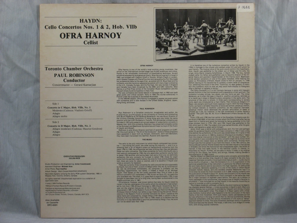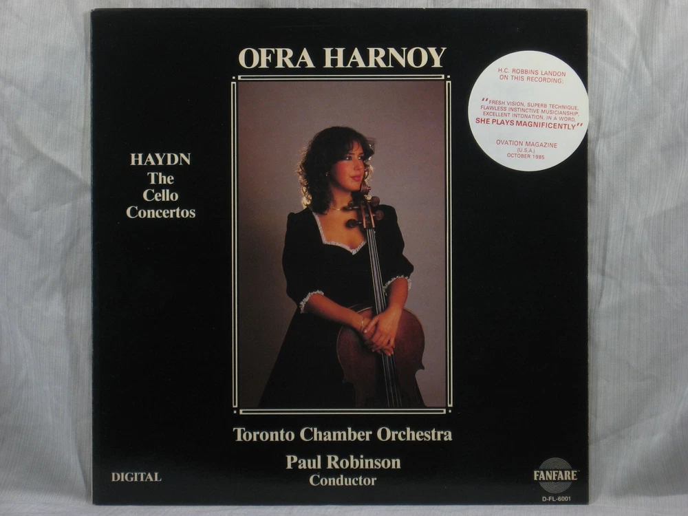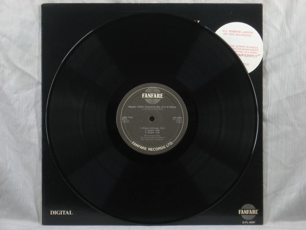 This 1984 Canadian import stereo album by Fanfare Records (D-FL-6001) features performances of Haydn's Cello Concertos ( Concerto in C Major, Hob. VIIb, No. 1; and Concerto in D Major, Hob. VIIb, No. 2) by cellist Ofra Harnoy, accompanied by the Toronto Chamber Orchestra, conducted by Paul Robinson. Album notes are in English. The outer sleeve shows a large round cover blurb sticker with a rave quote from H.C. Robbins Landon in the October, 1985 edition of Ovation magazine, and a small collection index sticker in the upper right corner of the back. (Photo 2) This is one of many titles from an extensive collection of classical LPs and CDs that we will be listing here. All have been carefully stored for many years, played only on premium equipment, and show little to no wear. NOTES: Album sleeves may have a small index sticker, usually in the upper right corner of the back, which was applied when the album was first purchased for this private collection. Please be sure you know the Shipping charge to your address before bidding. See the Shipping and Handling section of this listing for all rates, including international Shipping charges. Please do not copy any part of this listing without permission.