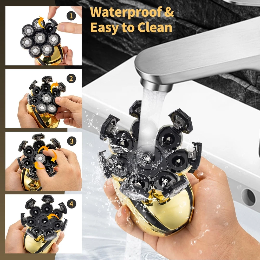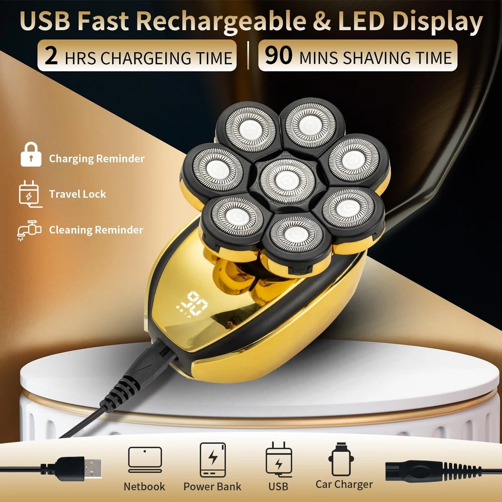 Head Shavers for Bald Men Electric Razor for Men's Head and Face Professional Mens Razors Rotary Head Shavers Rechargeable 8D Rotary Shaver Grooming Kit with Type-C Charge Product Details Brand: VOTMONI Recommended Uses For Product: Scalp Special Feature: Waterproof, Dry Shave, Wet, Lighted, Ergonomic Design Power Source: Corded Electric Included Components: Cleaning Brush Package Dimensions : 8.2 x 3.9 x 3.1 inches; 1.26 Pounds Item model number : LD-108804 Batteries : 1 Lithium Ion batteries required. (included) Date First Available : December 19, 2023 Manufacturer : VOTMONI Country of Origin : China Double Precision Shaving Head Blade: Our bald men's shavers use double-layer durable titanium blades, with sharp edges that can accurately capture long and short hair. The 360 floating blade can better fit the contour of the head, effectively and accurately shaving while reducing friction and irritation to the skin, better protecting your skin. In addition, dual track precision magnetic heads can achieve cleaner and smoother magnetic heads in a short period of time. All in One Grooming Set: This bald head shaver has 6 detachable attachments, including 8D floating head, sideburns trimmer, facial cleaning brush, nose & ear trimmer, facial cleansing brush, soft facial sponge, this detachable attachment can satisfy your head shaving and facial care needs such as trimming and combing facial hair, trimming nose hair, smoothing stubble, cleaning the face, shaving beard, body hair, etc. USB Fast Charging & LED Intelligent Display:The head shaver is equipped with a large capacity battery and USB cable, which can be quickly charged for 2 hours and used cordless for 90 minutes, allowing you to pick up the shaver even if you forget to charge it. And the shaver is equipped with an intelligent display screen, that is, the battery percentage can be displayed, so you can decide when to charge your shaver after using. Waterproof Wet & Dry Electric Shaver: The electric shaver adopts upgraded waterproof technology, so you can not only have comfortable dry shaving, but also wet shaving with foam, and even shave in the shower. The waterproof design throughout the body allows you to clean men's shavers under tap water, paired with the provided small brush, making the cleaning process simple and convenient. Perfect After-Sale Service: If you like it, please rest assured to add it to your shopping cart! We will provide perfect after-sales service for every customer. If you have any questions, please feel free to contact us and we will provide you with the best solution within 24 hours timely. Give us trust and give you a perfect shopping experience! Multifunctional Mens Electric Shaver The bald head shaver is comfortable and nearly smooth for bald men with no dead ends in shaving. It provides six sets of independent floating shaving heads, which are are more efficient than regular double headed razors. The blades of this men's shaver feature a new automatic sharpening function. This electric shaver has a smooth touch for balding, elastic fit, and adapts to different facial contours for a smooth and comfortable experience. Package Content: 1Electric razor 1Nose & ear trimmer 1Hair clippers head 1Soft facial massage brush 1Facial cleaning brush 1Cleaning brush 1USB charger 1Head protective cover 2Replacement shaver head 3Limit combs(3mm/5mm/7mm) Specifications: 1.Charging Time: 2 hours 2.Working Time: 90 mins 3.Battery: Lithium 4.Type-C Charging