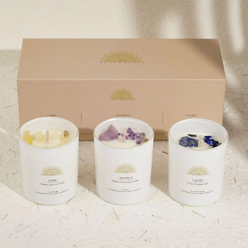 Looking for a unique and thoughtful gift? This set of three crystal-infused candles is the perfect choice! Each candle comes with a hidden crystal inside, beautifully packaged and ready for any special occasion. Every candle in this set is thoughtfully crafted with a unique fragrance that enhances the natural energy of the crystal inside. Enjoy the perfect combination of delightful scents and positive vibes. These candles are ideal for relaxation, meditation, stress relief, and adding a special touch to your home decor. AMETHYST CRYSTALS: Achieve peace and balance with Amethyst. Renowned for its calming and protective properties, Amethyst heightens intuition, promotes relaxation, and helps relieve anxiety and stress. LAZURITE CRYSTALS: Enhance your wisdom and intuition with Lazurite. This crystal is known for promoting insight and truth, enhancing intellectual abilities, boosting communication skills, and encouraging a deeper connection with the self. CITRINE CRYSTALS: Uplift your spirit and boost motivation with Citrine. Known for its happy and invigorating energy, Citrine enhances mental clarity and creativity, helps manifest success, and attracts wealth and prosperity. DIMENSIONS: The gift box measures L 9.12" x W 3.5" x H 3.37" Each votive candle measures W 2.37" x H 2.87" WEIGHT: Total weight is approx. 0.9kg Each votive candle holds 3.5oz (100g) of pure soy wax BURN TIME: Each crystal candle has an approx. burn time of 20 hours, for a total of up to 60 hours CANDLE SAFETY INSTRUCTIONS: 1. Never leave a burning candle unattended 2. Ensure wicks are upright and trimmed to 1/4” each time candle is lit 3. Always burn candles on a protected, heat-resistant surface 4. Avoid using near drafts and flammable materials 5. Keep out of reach of children and pets 6. Do not burn for more than 4 hours at a time 7. Do not burn when there is 1/4” wax remaining 8. Do not attempt to remove crystals while candle is lit ✅ LUXURIOUS CRYSTAL INFUSED CANDLES - All Candles Are 3.5 Once White Sine Jar with gem and crystal, Manifestation Love And Joy To Your Home , Amplify Happiness And Energy , Bring Luxury To Home Decor And Balance Chakra During Meditate ✅ Charming and Unique - Indulge yourself or someone special with these Amethyst, Lazurite, and Citrine crystal candles, designed to release positive energy and a delightful fragrance. ✅ PURE BLEND OF FRAGRANCE OILS - Our 100% Hand Made Crystal Candles Are Infused With Hand Picked Blends Of Highest Quality Fragrance Oils . The Stone Scented Candles For Aromatherapy Have 3 Scents: 1. Lavender Scent With Ametyst, 2. Sea Salt & Orchid Scent With Lazurite, 3. French Vanilla With Citrine ✅ SMOKE FREE AND BURN CLEAN - Our Candles Are Crafted With One Cotton Wick And 100 % Soy Wax Candle With Crystals Inside Which Bring Calming And Cleansing Ambiance To Your Environment And Clear Negative Energy ✅ PERFECT GIFT FOR LOVED ONES - meaningful gift that bring love and peace . our aromatherapy candles healing spiritual gifts for women and loved ones. our gemstone candles with pure crystal perfect gift idea for birthday , wedding , meditation , friends ...