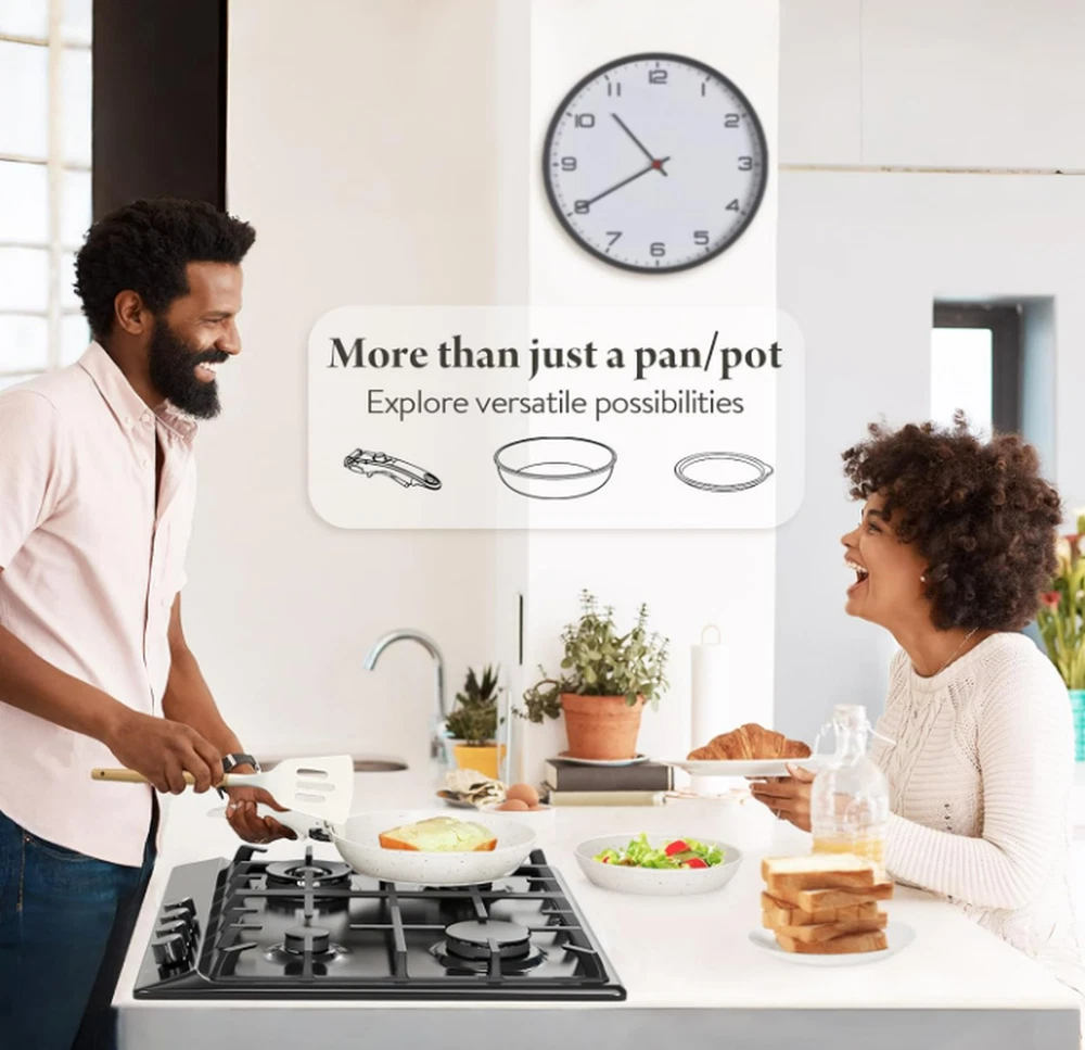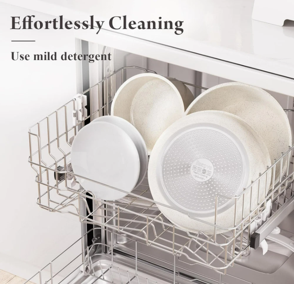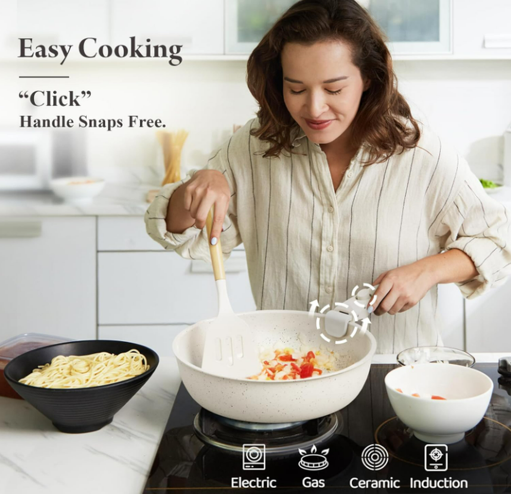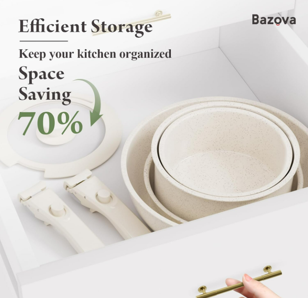 Material Aluminum Color Cream White Brand bazova Size 17-Pieces Ceramic Set Is Dishwasher Safe Yes About this item Healthy Ceramic Coating: Made of natural ceramic, our kitchen cookware set is Teflon-free and guarantees no PFAS, PTFE, PFOA, lead, or cadmium. Ideal choice for safety-conscious families, especially those with babies Effortless Storage: Save 70% kitchen space by neatly stacking pots and pans in cabinets or drawers; perfect for compact spaces, RVs and campers Innovative Detachable Handles: Transform pots with a "CLICK" into baking dishes, serving plates, or fridge storage, enhancing versatility. NOTE: The handle is made of bakelite and silicone, overheat will cause discolor or even burnt.Please detach it when you are not using it for fixing. Ultra Non-Stick Performance: Experience 5X superior non-stick cooking with minimal oil - food just slides off smoothly.No toxic fumes emitted, even when overheated. NOTE: using oil spray will damage the coating. Just add a small amount of butter or oil will be enough.Low to medium heat is suggested for better non stick performance. Easy Cleaning: While our cookware is dishwasher-safe for your convenience, we highly recommend handwashing. A simple rinse or quick wipe effortlessly removes any residue, ensuring your cookware remains spotless and maintains its pristine condition with ease Universal Cooktop Compatibility: Enlarged, thickened magnetic base ensures compatibility with all stovetops, including induction and oven; Crafted from recyclable aluminum ensures lightweight yet sturdy, and promotes rapid and even heating 17-Piece Set Includes: 1.5QT(6.3") & 2.1QT(7") saucepans, 8-inch & 10-inch frying pans, 3.2QT(10")sauté pan, 2 removable handles, 7-inch & 10-inch glass lids, 6.3-inch & 7-inch fridge lids, 4 pot protectors, silicone slotted turner & ladle Seamless mobility with a click – the removable handles provide flexibility, effortlessly transitioning cookware from stoves to the oven, grill, fridge, and finally to the dinner table. Servers as a frying pan, a dinner plate From Stove, To The Table Unlock the boundless potential of the cookware with its detachable handle – perfect for cooking on any stovetop or serving as elegant dinnerware on the table. or even a fridge container To The Refrigerator Store leftovers in the fridge with the included lids to minimize waste. Save 70% Space - Our cookware set is designed for perfect stacking in kitchen drawers, cabinets, cupboards, RVs, travel trailers and motorhomes. Important Tip- We suggest to detach the handle during cooking when you don't need it for fixing. This could greatly extend the lifespan of the handle. Ultra Smooth & Nonstick Easy Cooking Smooth interior makes it exceptionally nonstick - perfect for everyday cooking like pancakes, eggs, steaks, and fish. Please notice high temperature will damage the non stick coating. Clean with 5 Sec. Easy Cleaning Rinse or wipe clean - zero residue in 5 seconds. Alternatively, toss it in the dishwasher for time-saving convenience. Please notice disherwasher could damage the non stick coating in some conditions. Oven Safe Detach the handle for oven use. Let's whip up a delicious frittata! All Stoves Compatible Feature an enlarged and thickened bottom for rapid and even heating. The magnetic conductive bottom ensures compatibility with all stovetops, including induction. Sustainability features This product has sustainability features recognized by trusted certifications. Carbon impact Carbon emissions from the lifecycle of this product were measured, reduced and offset. As certified by ClimatePartner certified Product information Material Aluminum Color Cream White Brand bazova Size 17-Pieces Ceramic Set Is Dishwasher Safe Yes Material Type Free Cadmium Free, Perfluorooctanoic Acid (PFOA) Free,Perfluorooctane Sulfonate (PFOS) Free, PFAS Free, Polytetrafluoroethylene (PTFE) Free, Lead Free Compatibility Options Compatible Number of Pieces 1 Closure Material lid Included Components 1.5QT(6.3") & 2.1QT(7") saucepans, 8-inch & 10-inch frying pans, 3.2QT(10")sauté pan, 2 removable handles, 7-inch & 10-inch glass lids, 6.3-inch & 7-inch fridge lids, 4 pot protectors, silicone slotted turner & ladle Is Oven Safe Yes Item Volume 2.95 Liters With Lid Yes Manufacturer bazova UPC 199284844407 Manufacture Year 2024 Special Feature Induction Stovetop Compatible Package Dimensions 12.48 x 11.85 x 6.77 inches Item Weight 9.31 pounds ASIN B0CRSZ9MC5 Country of Origin China Item model number BZ101