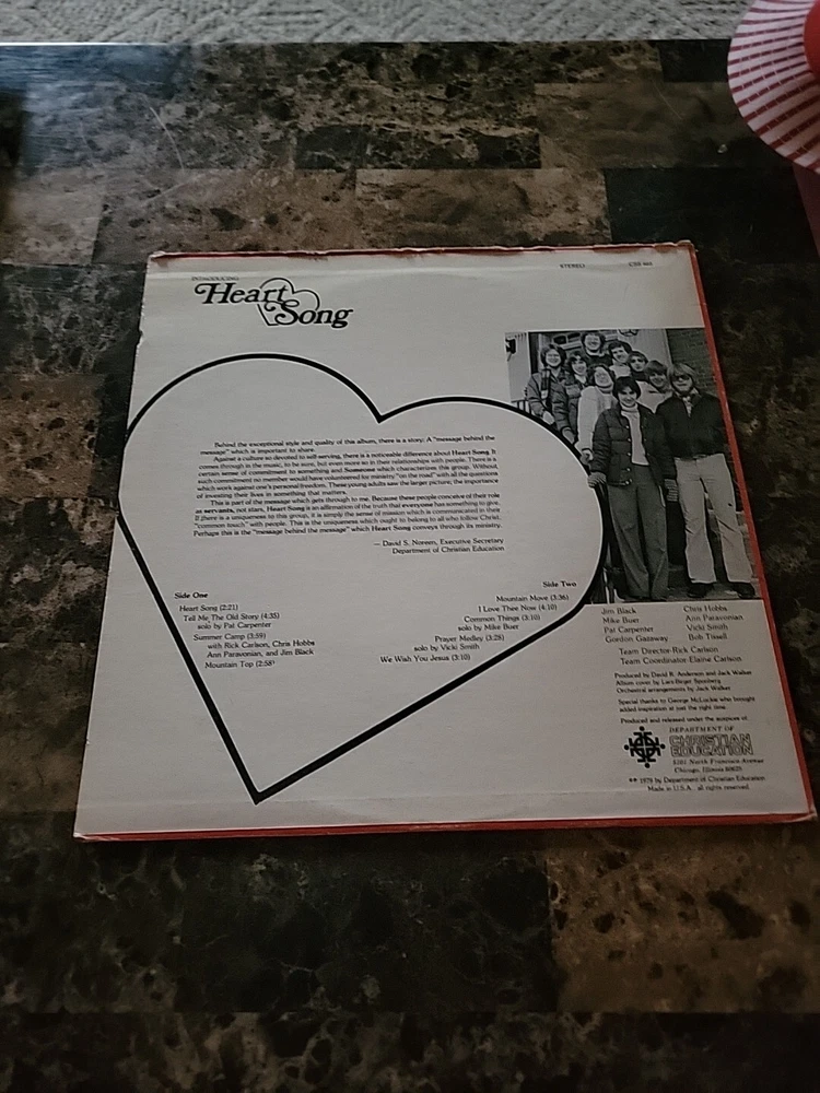 This is a 33 RPM LP record titled "Heart Song: Self Titled" by the artist Heart Song. The record is in the format of a 12" vinyl record with a cardboard sleeve. The record grading is Very Good (VG) and the sleeve grading is Good (G). The genre of the music on this record is Gospel, Religious & Devotional, and Contemporary Christian. Heart Song's self-titled LP is a must-have for fans of gospel and Christian music. The vinyl record is in great shape, with no major defects or damage. The cover art is modest, but the music inside is sure to impress. Whether you're a longtime fan of Heart Song or just discovering their music, this LP is a great addition to any collection.