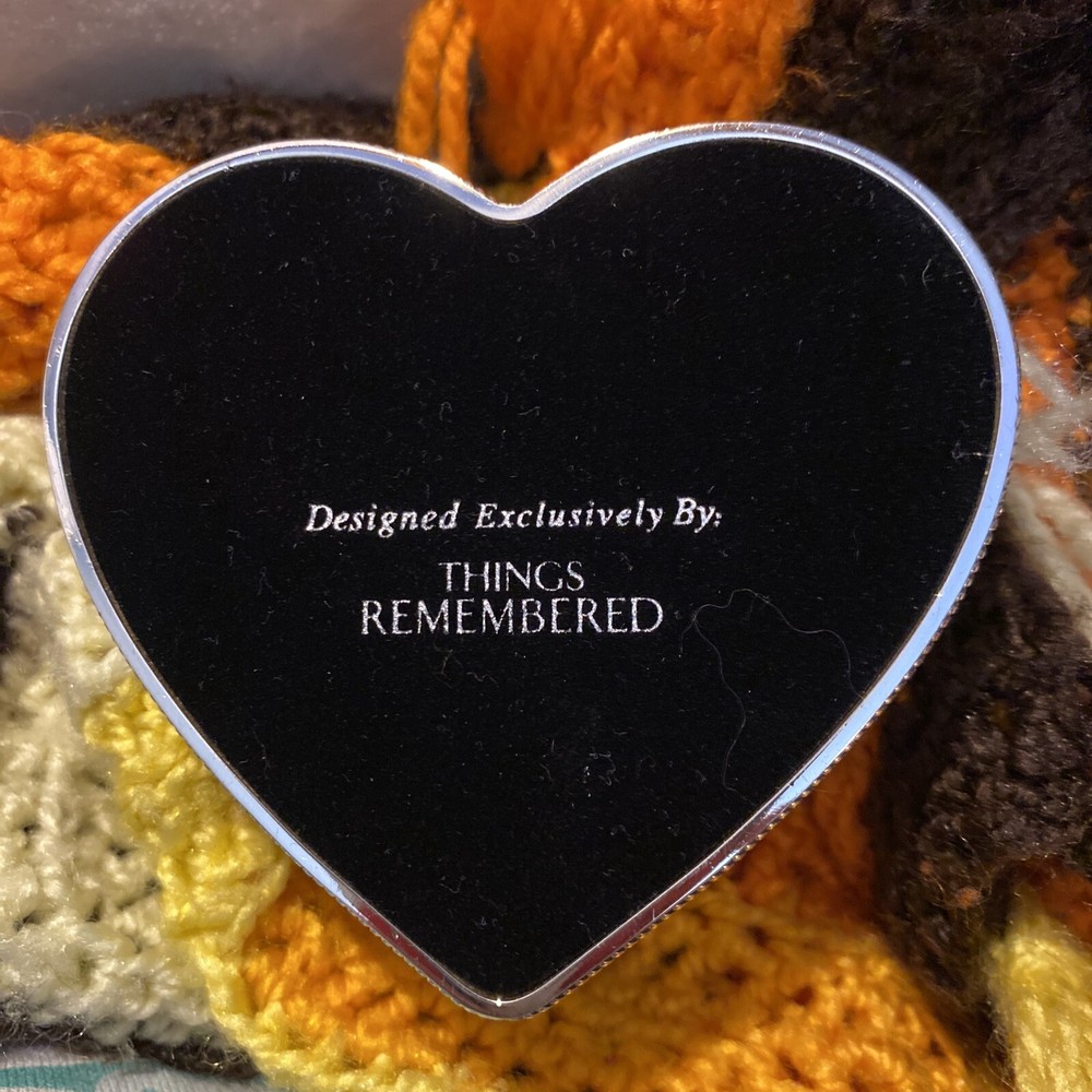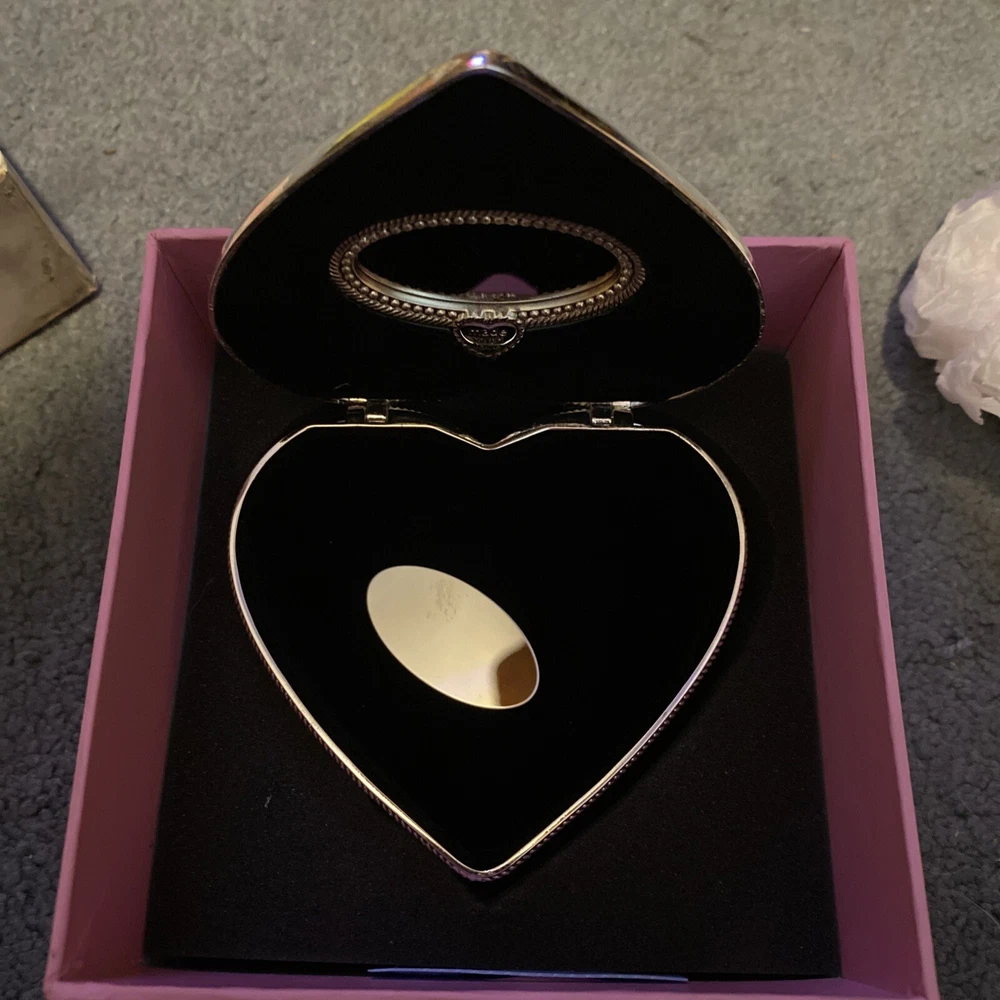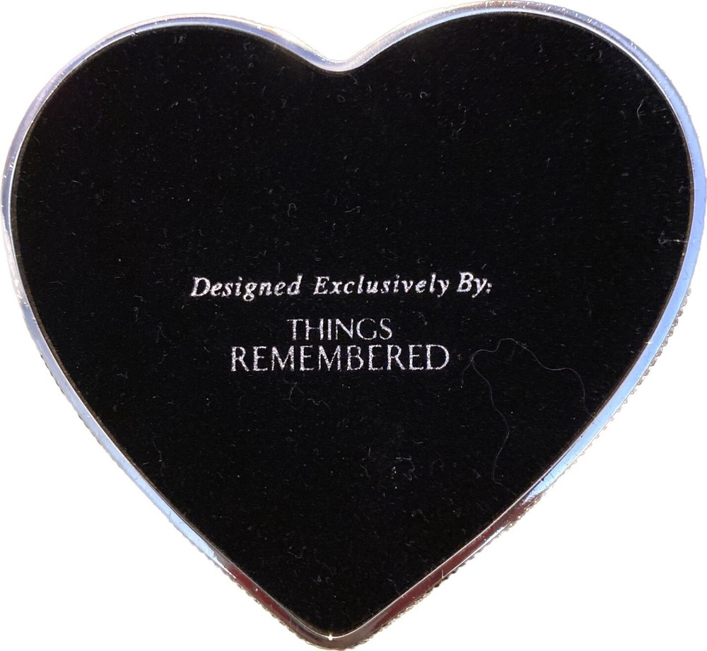 This is a heart-shaped jewelry box from Things Remembered, featuring an angel design. The box is made of silver metal with a glossy finish and velvet interior. It is small in size, measuring 3.5 inches in length and 2 inches in height. The keepsake box is adorned with hearts and is suitable for all occasions, making it a thoughtful gift for adults. The jewelry box was in its gift box when both survived a house fire. The jewelry box is still brand new, however the box I’m sending it in (which has the heart shape cut into it for perfect fit) was in the house, but far enough from the fire to not burn up, yet, it did receive soot stains & looks dirty. It is perfectly clean inside. You will probably want to remove the jewelry box & toss the gift box it sits in, upon delivery. The jewelry box has never been used.