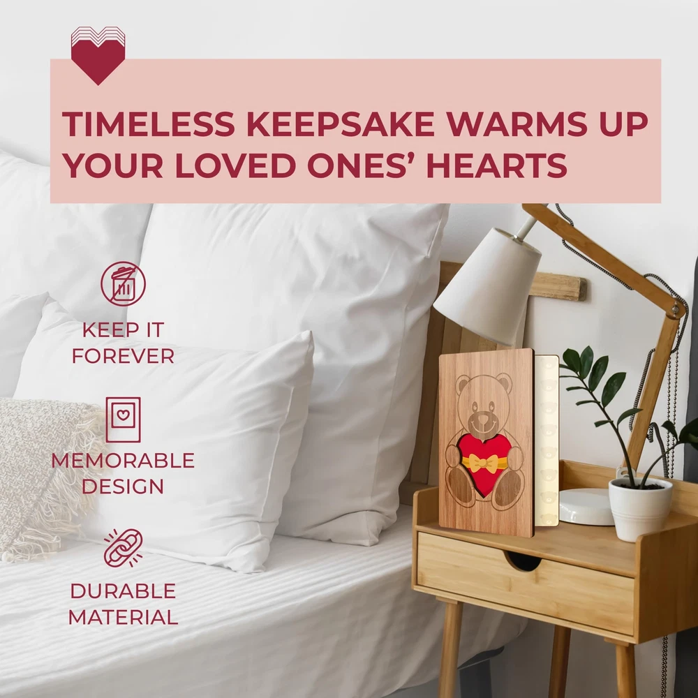 Let them know that they are surrounded by warmth and love with this teddy bear inspired card. This lightly colored wood card features a sweet teddy bear holding a brightly colored red heart tied with a yellow ribbon. This pop of color shows the recipient that they're in your heart. Inside the playful teddy bear theme is reflected as the perfect backdrop for a handwritten message or note. UNIQUE EXPRESSION OF LOVE - Elevate heartfelt messages with HeartSpace's handcrafted bamboo cards. Swap paper for this distinctive wooden card, a perfect anniversary card for your wife, husband, or an 'I love you' card for your girlfriend. Express your love uniquely! ENDURING KEEPSAKE - The wooden anniversary card from HeartSpace isn't just a card; it's a durable, long-lasting memento of your affection. Perfect for any wedding anniversary or to express your deep, unspoken love. LUXURY & NATURE IN YOUR HANDS: Experience the luxurious blend of artistry and sustainability with HeartSpace's handcrafted bamboo cards. Paired with quality envelopes, they are perfect for birthdays or anniversaries. YOUR LOVE, YOUR WORDS - Inside, left blank, HeartSpace's Bamboo Love Cards offers a canvas for your emotions. Craft a personalized anniversary card or a sincere expression of love that truly speaks from your heart to your loved one. SUSTAINABLE LOVE EXPRESSIONS- Embrace Flora's commitment to sustainability and HeartSpace's mission for a cleaner, greener world. Our eco-friendly sustainable Love Cards are not just heartfelt messages; they symbolize love and respect for Mother Earth.